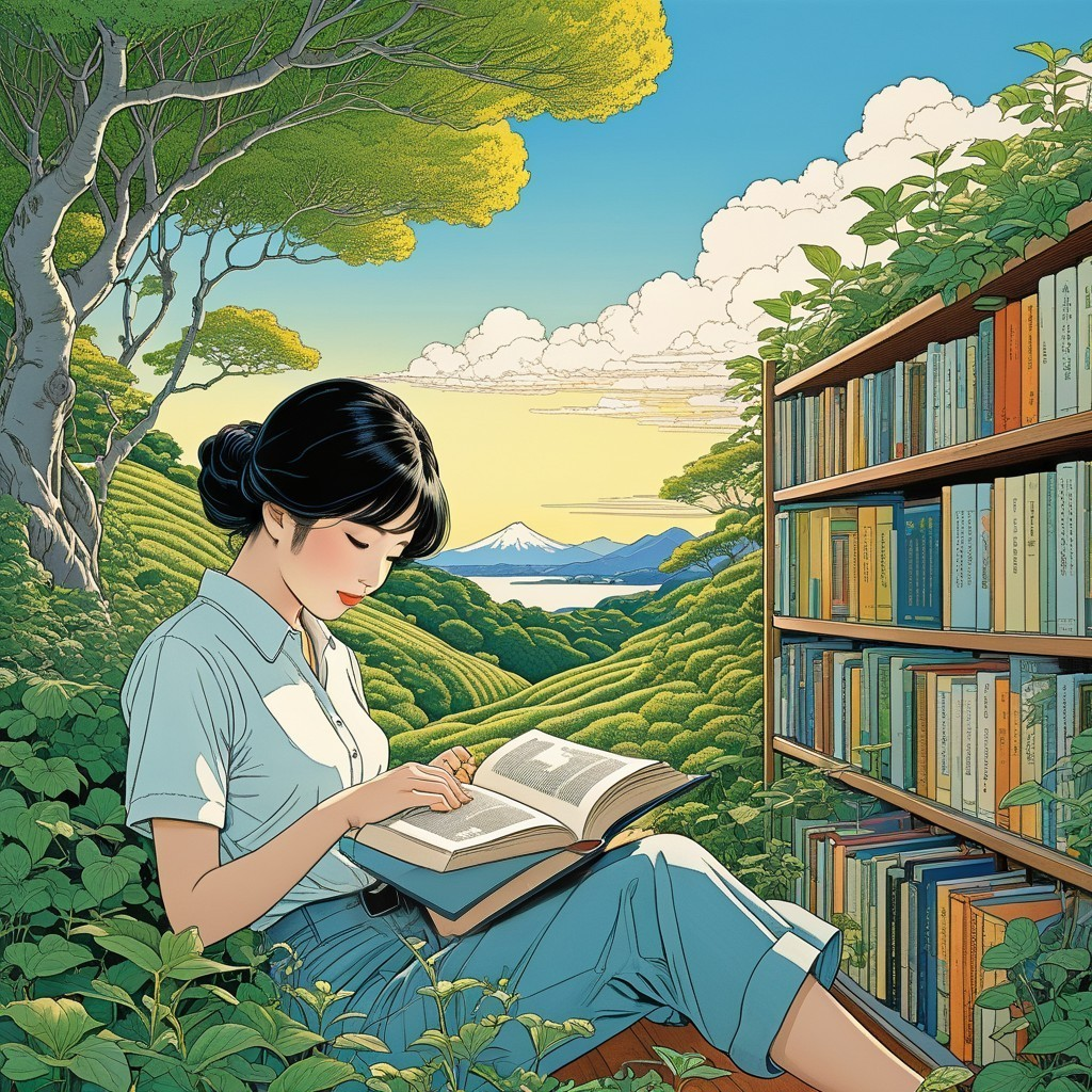 A woman reads a book amidst lush greenery with bookshelves and a distant mountain under a clear sky.