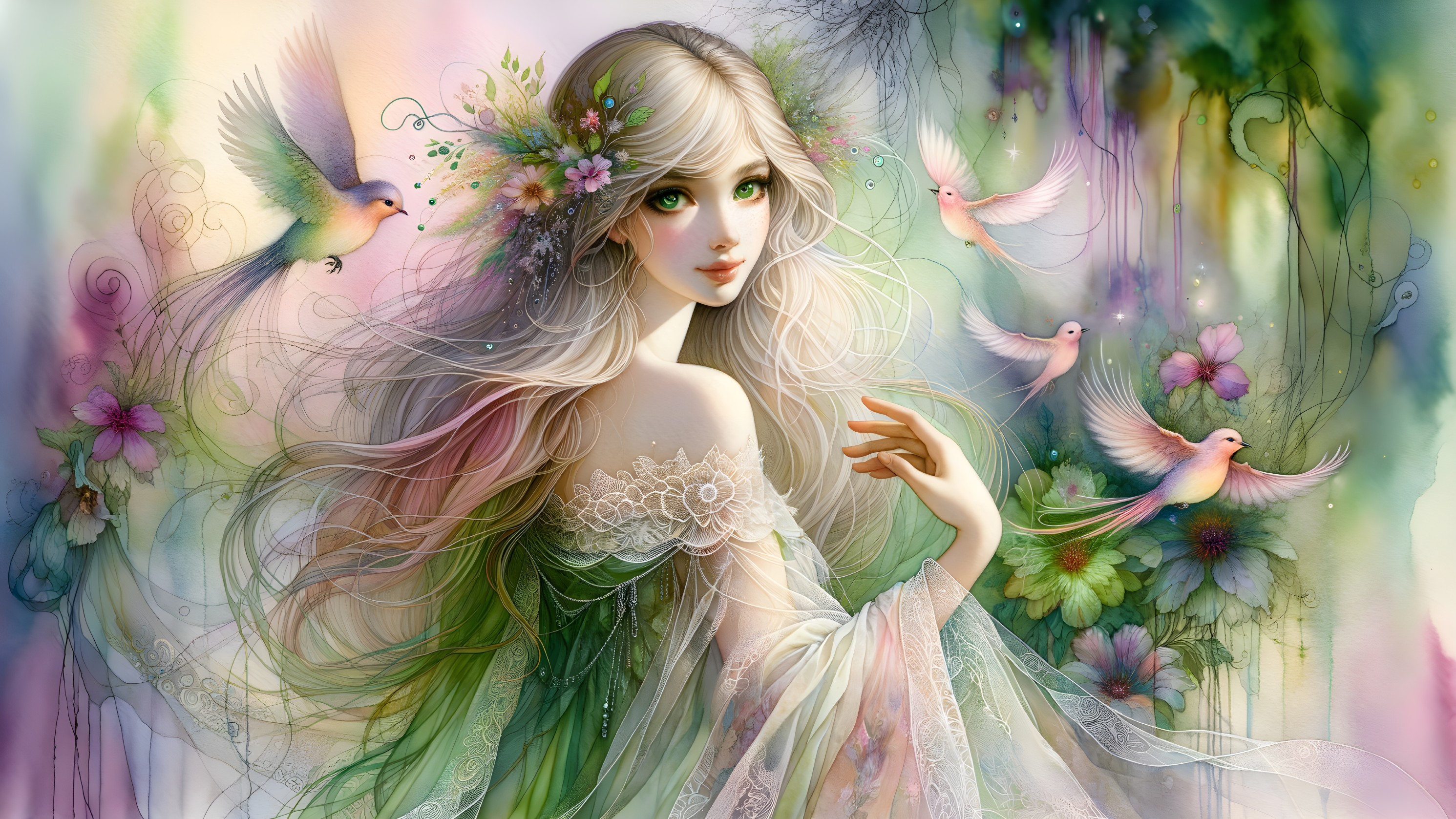 Whimsical Birds Amidst Roses in Dreamy Scene
