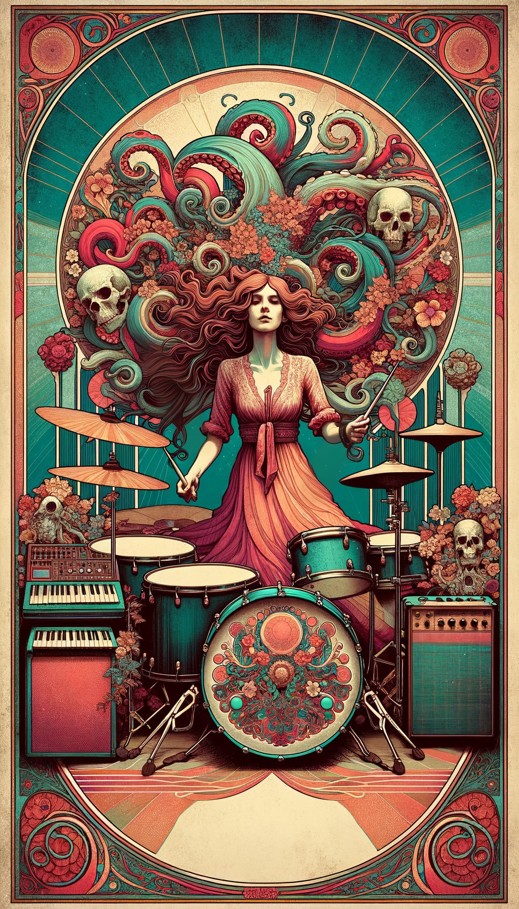 Elegant Drummer Shines in Dramatic Setting
