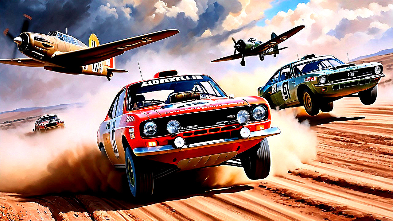 Rally Car Racing Under Vintage Aircraft
