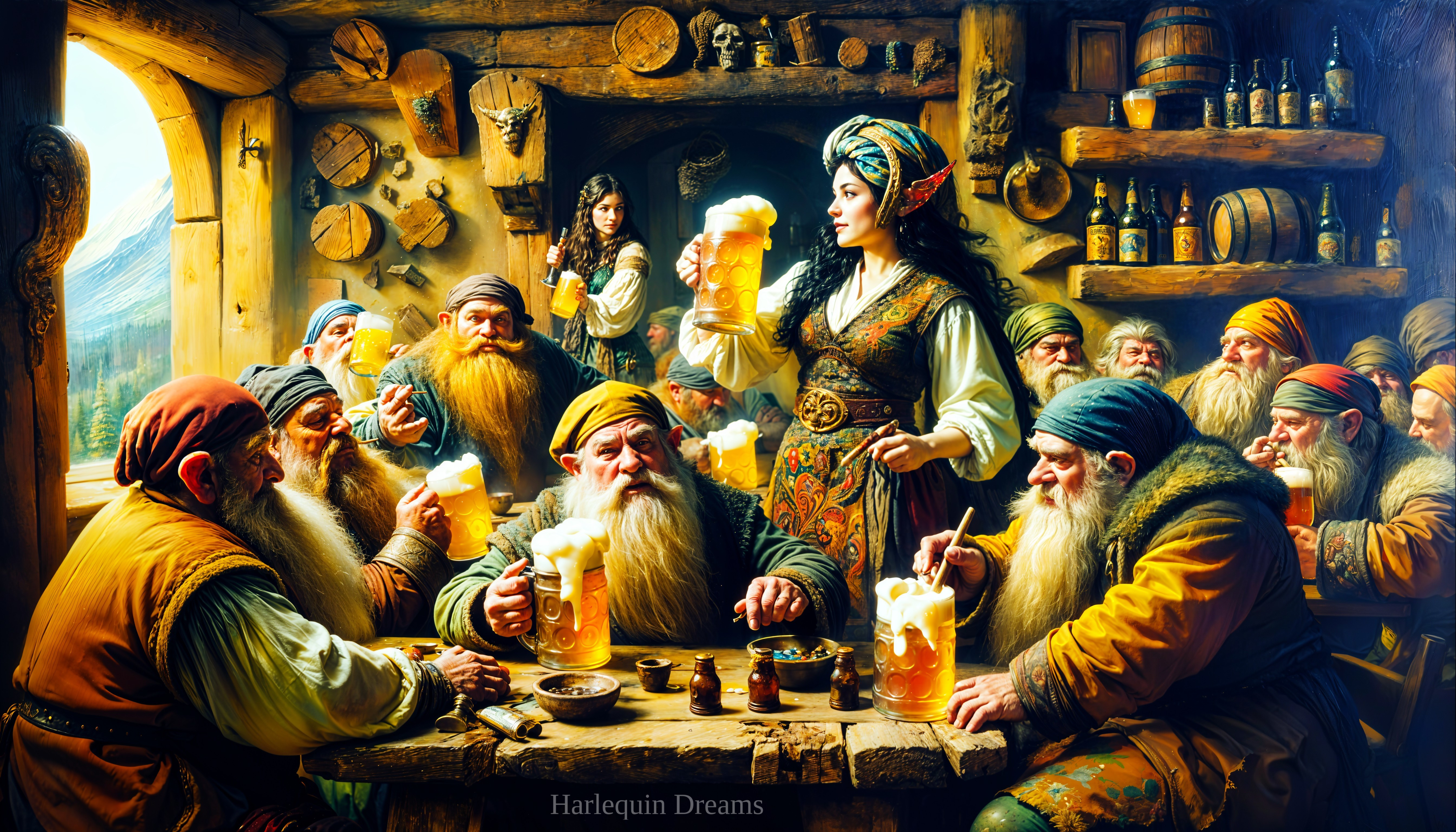 Whimsical Dwarves in a Moonlit Snowy Scene