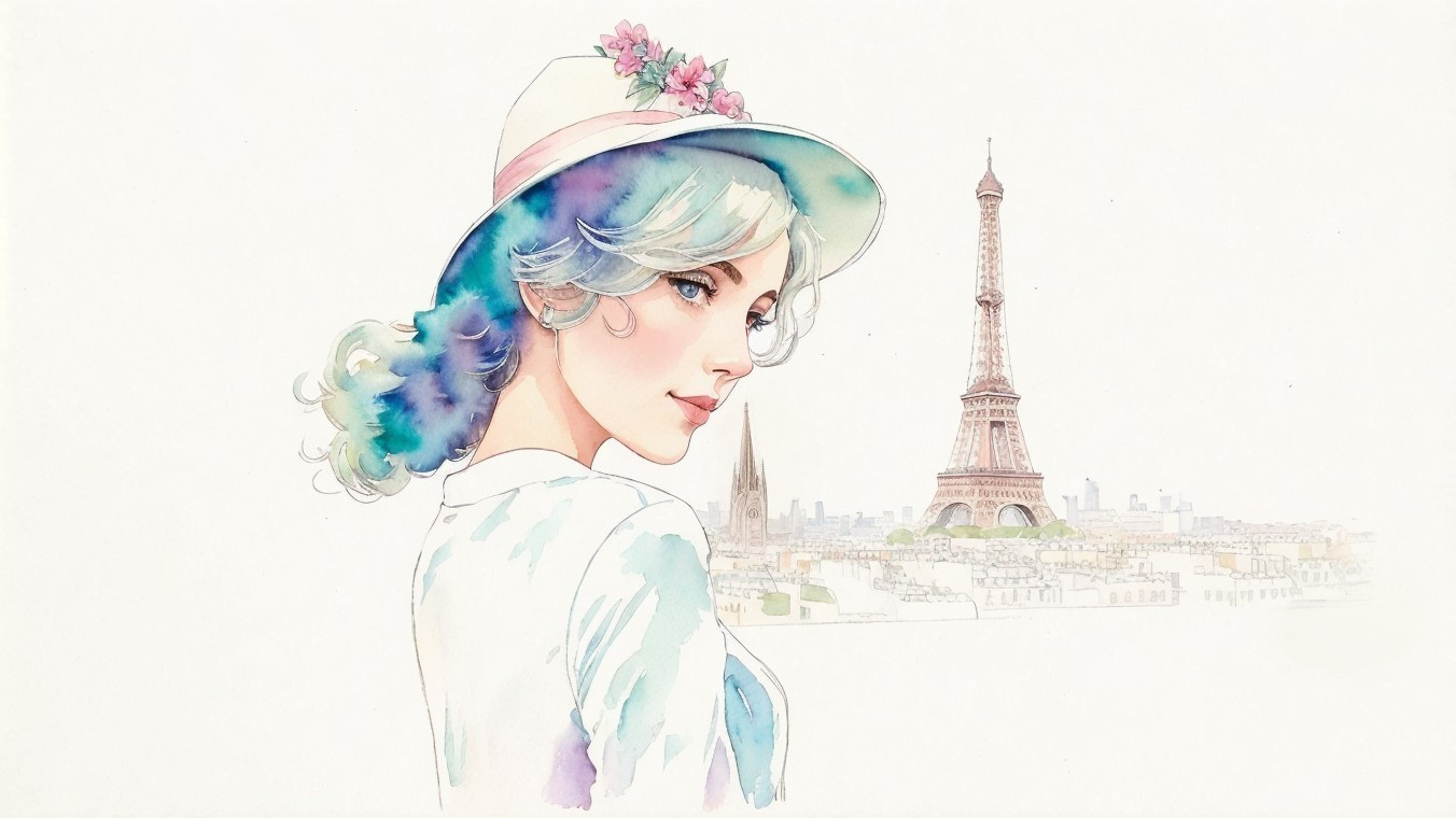 Paris in Watercolor; Woman at Eiffel