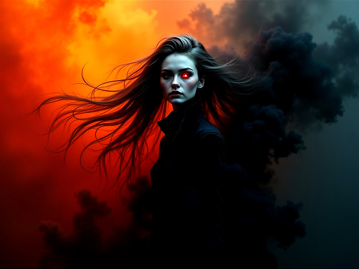 Intense Gaze Amidst Fiery Backdrop