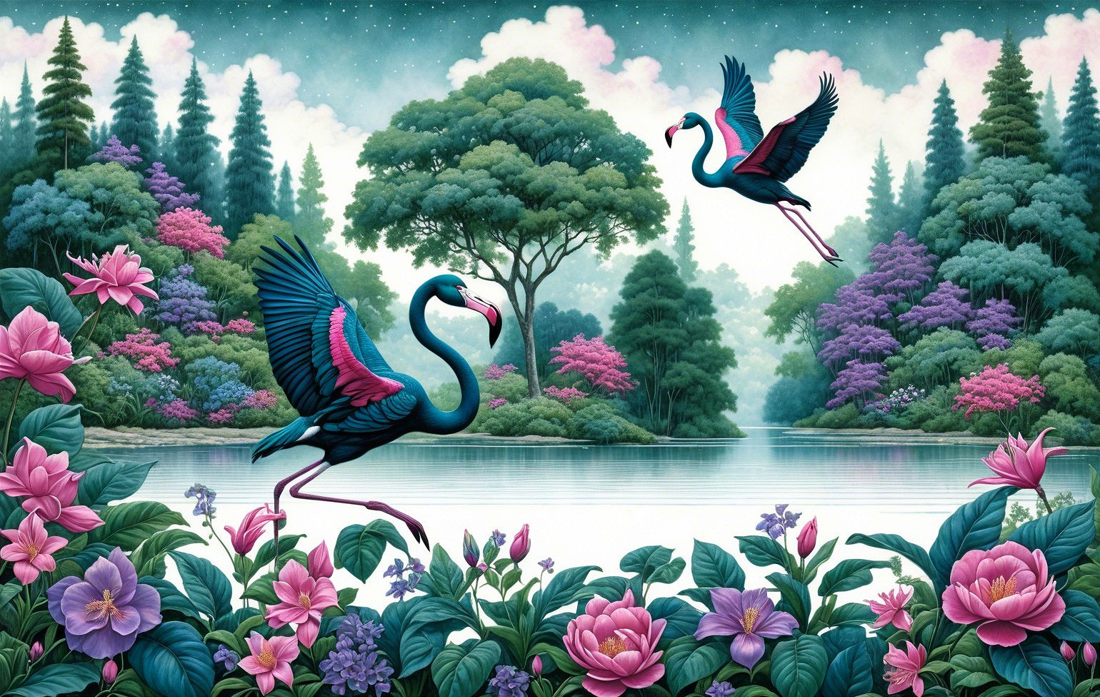 Flamingos Over a Serene Lakeside Garden