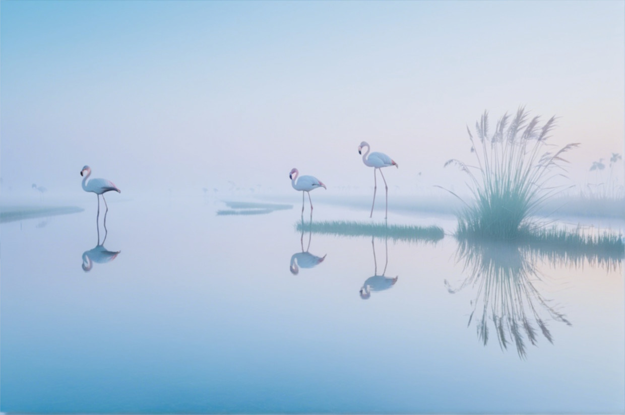 Serene Flamingos in Misty Waterscape