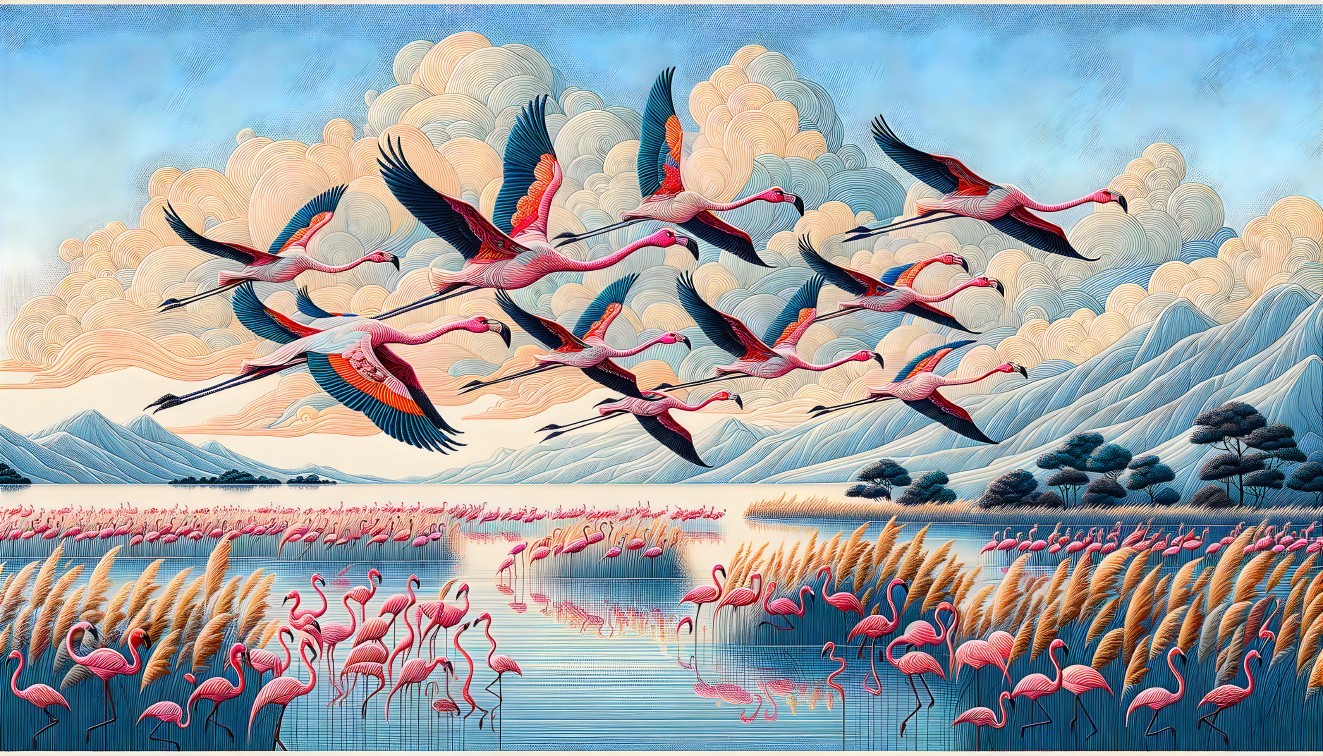 Flamingo Migration: Digital Art in Japanese Style