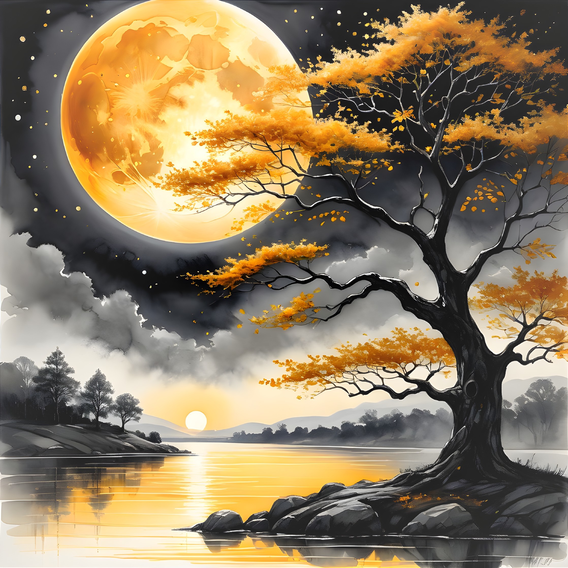 Ethereal Landscape with Golden Moonlight