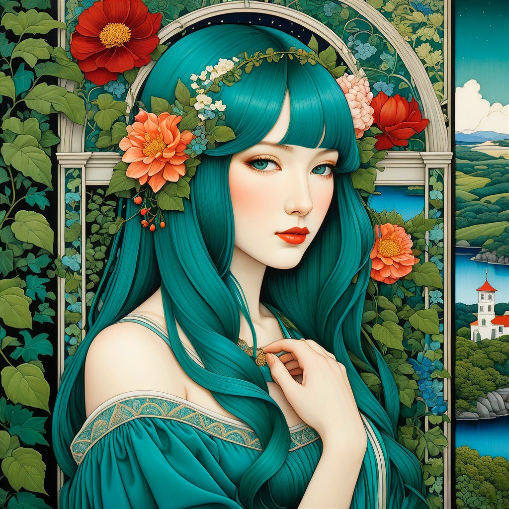 Woman with flowing hair surrounded by green plants and beautiful scenery