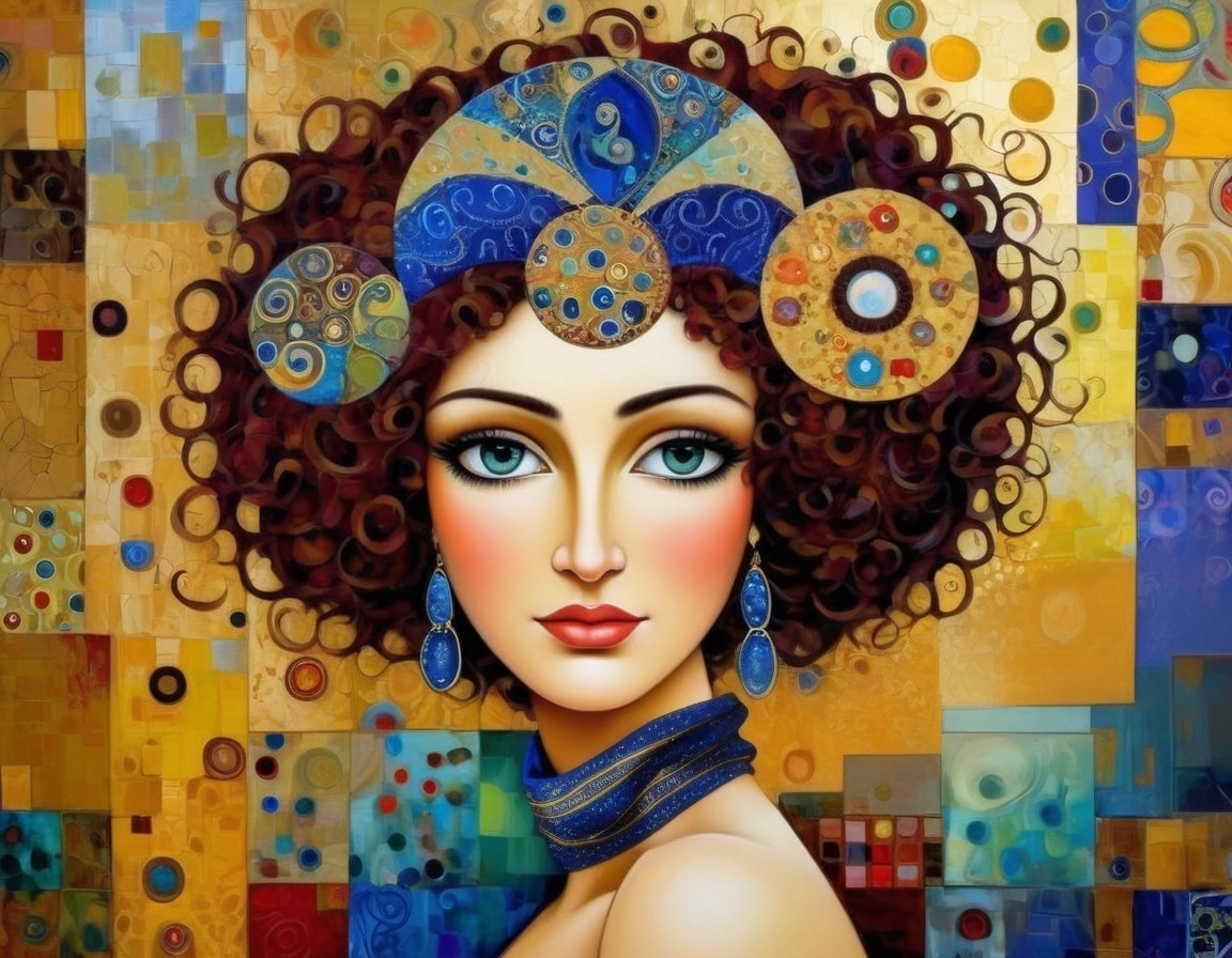 Curly Haired Beauty in Blue: Abstract Portrait