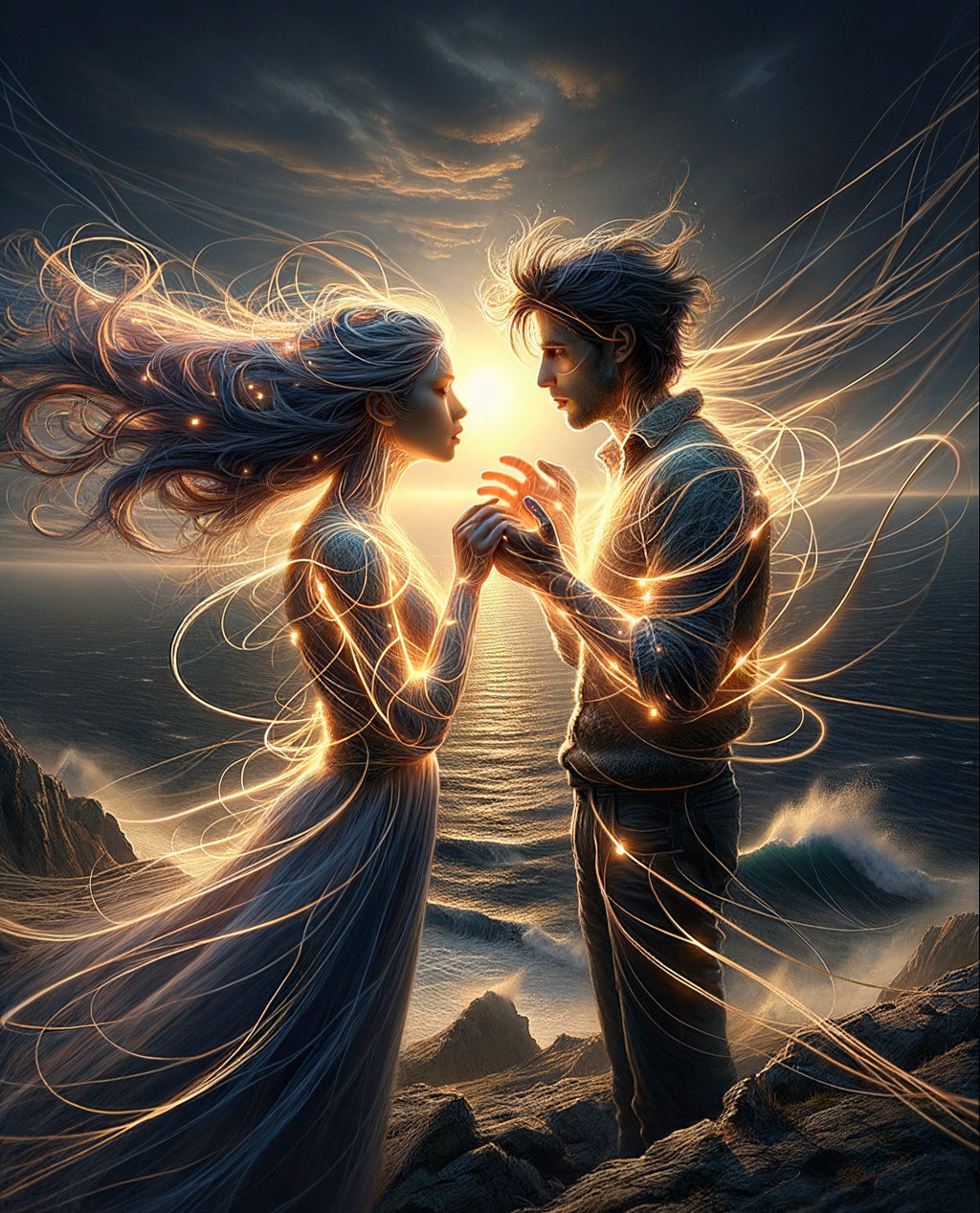 Glowing Embrace on Rocky Shore at Sunset