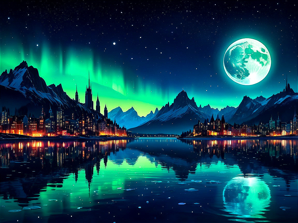Gothic Skyline Under Moonlit Northern Lights