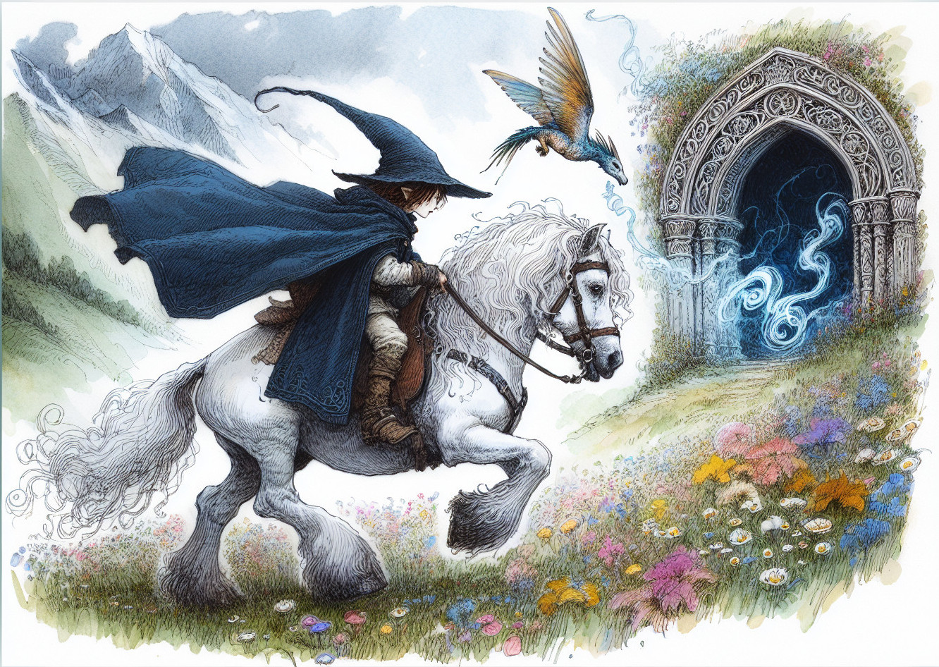 Mediaeval fantasy with white horse, in the style of the Limburg Brothers 14th Century France