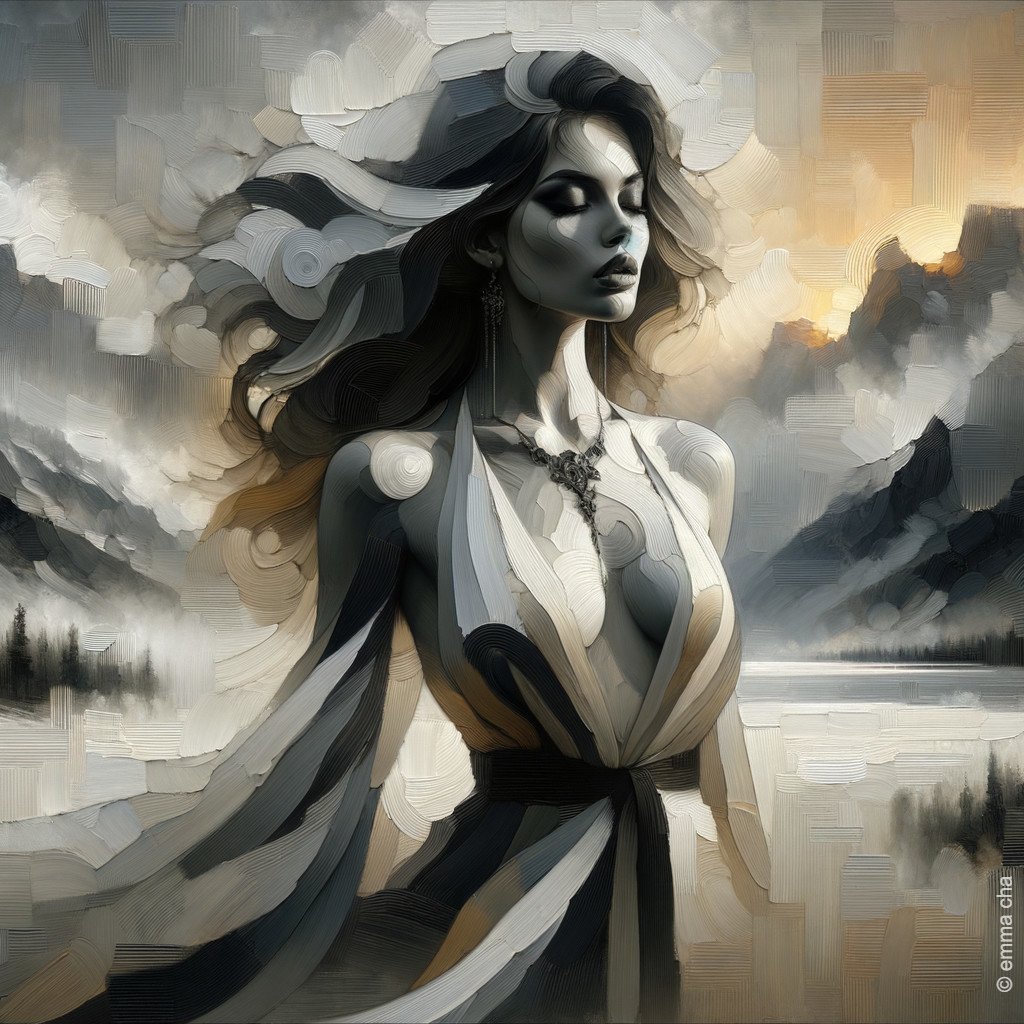 Black and White and Minimalist Impasto Portrait of a Female Fashion Model
