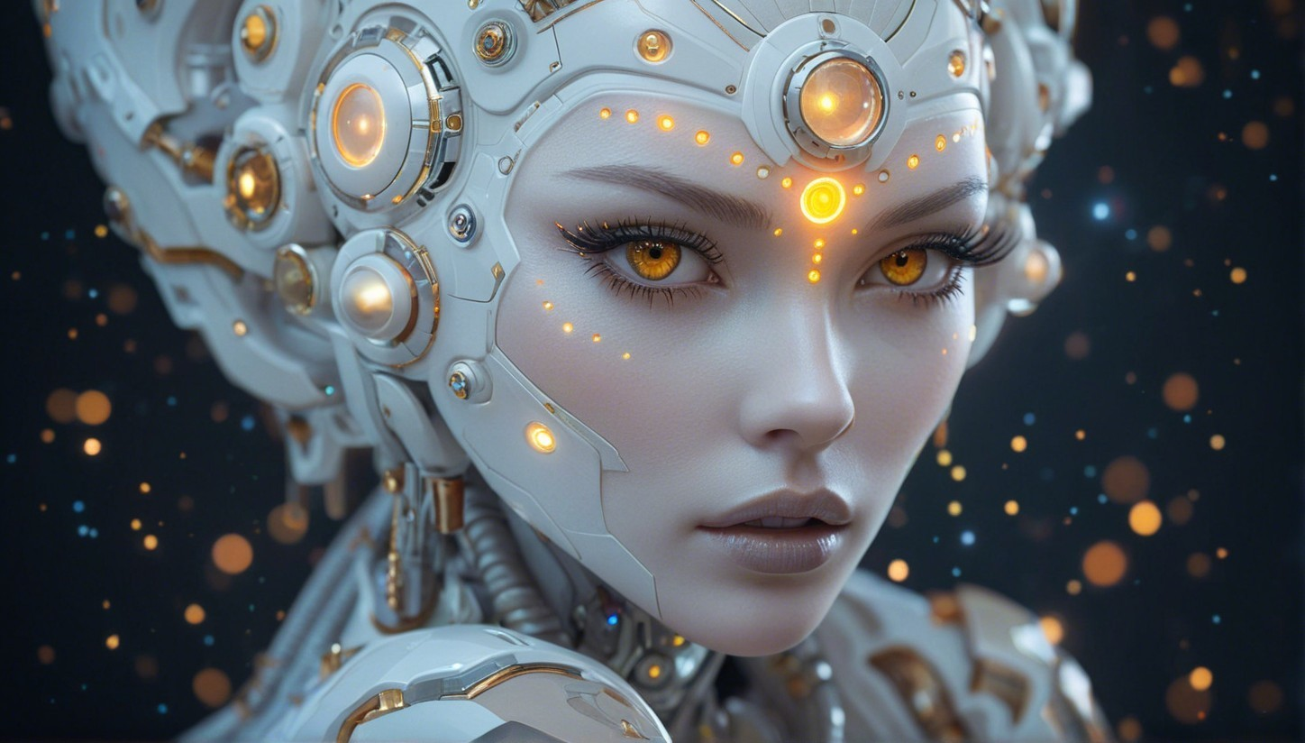 Futuristic humanoid girl with glowing accents in comprehension of harmony