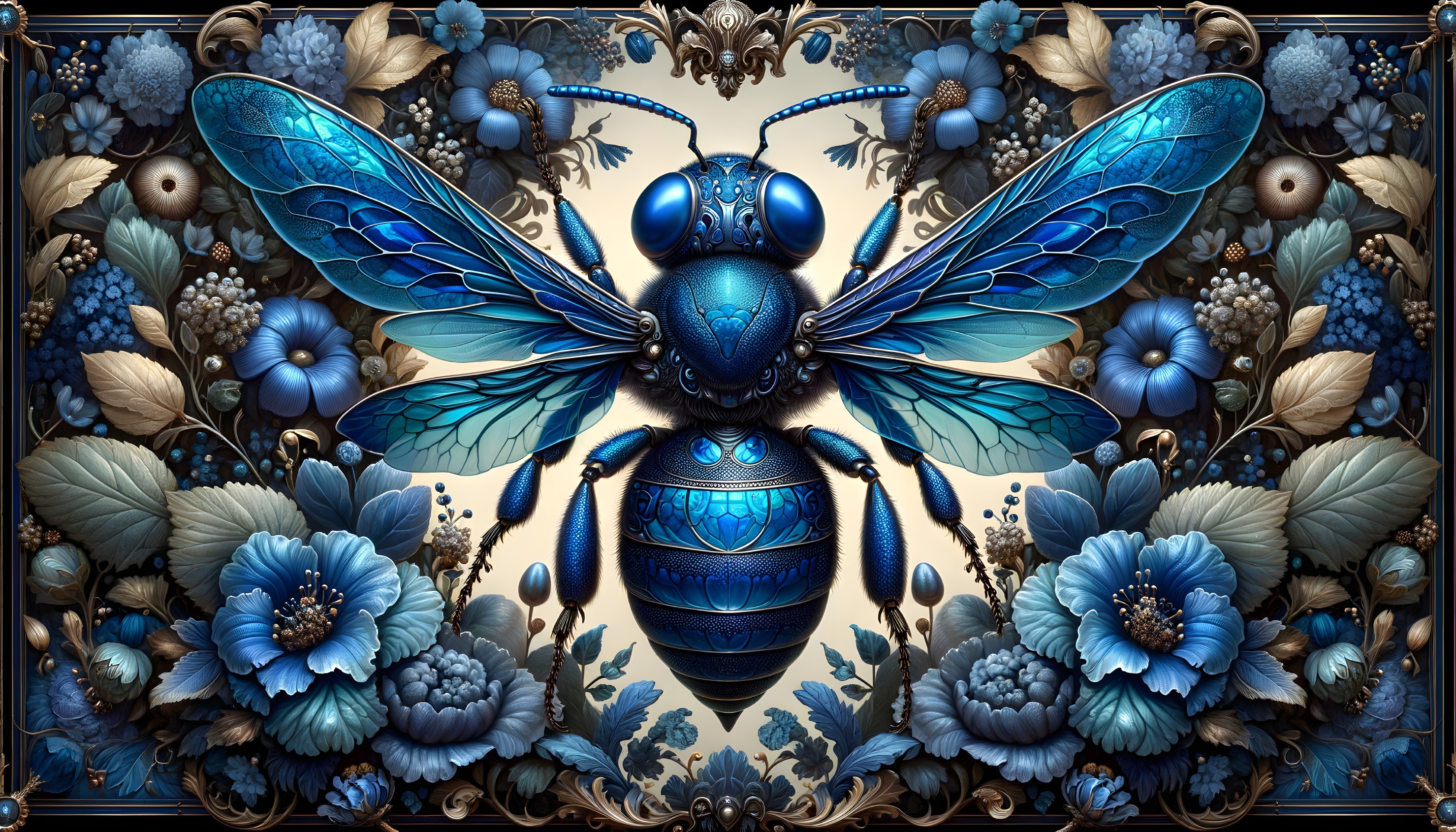 Majestic Blue Bee in Opulent Floral Surroundings