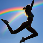 Joyful Leap Under a Vibrant Rainbow