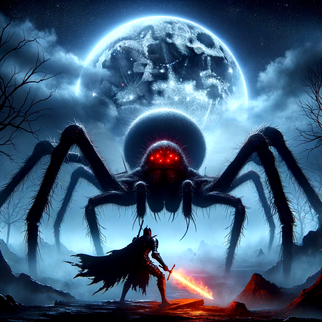 Brave and fearless Knight with Flaming Sword gaainst evil giant monstrous spider.