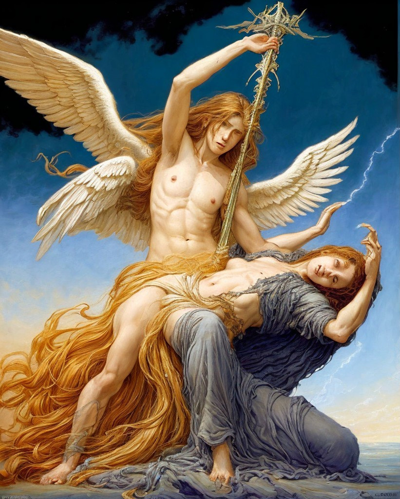 Majestic Figure with Golden Wings Illuminated. Archangel Michael