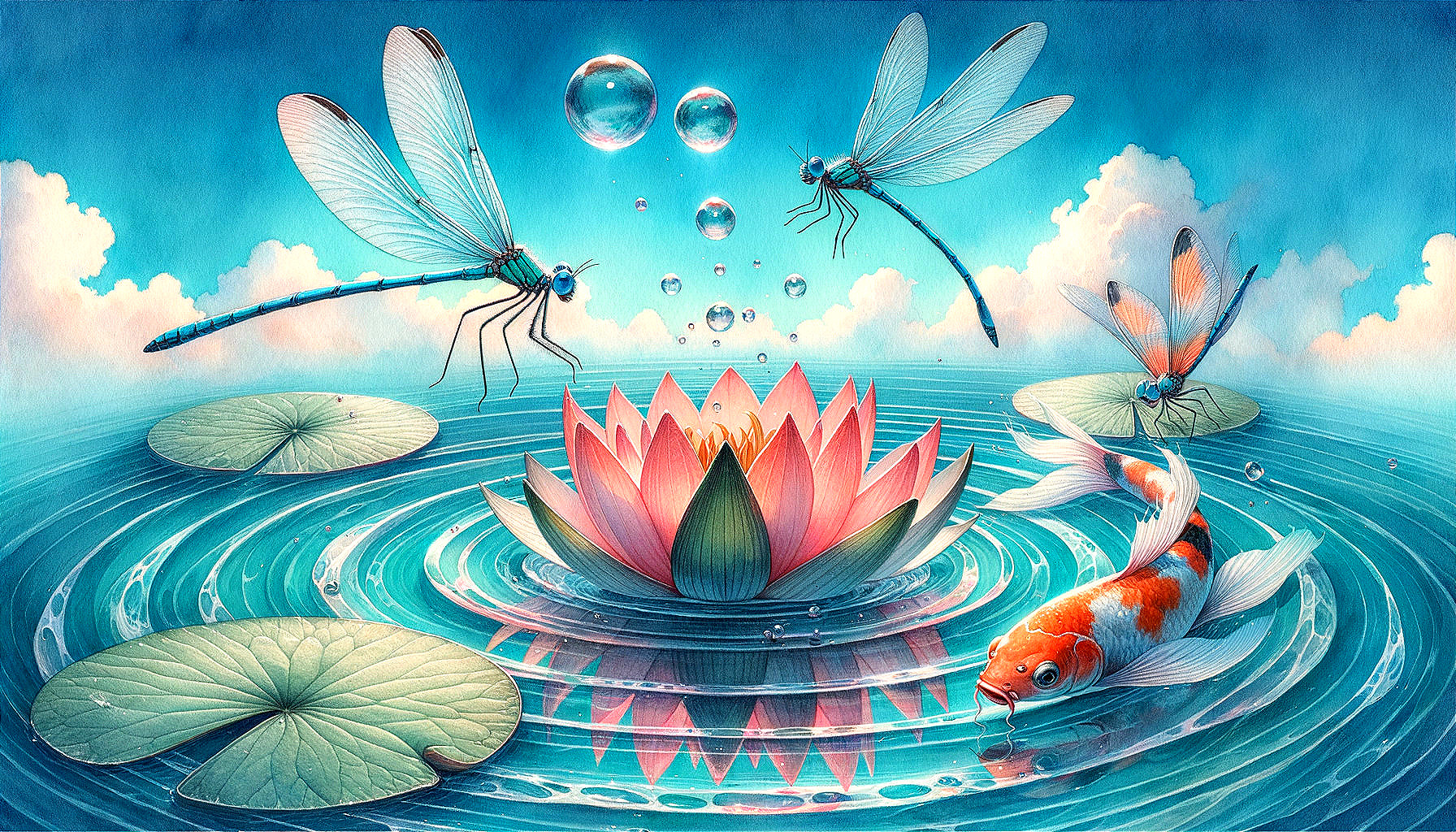Enchanted Pond: Damselflies and Koi Fish