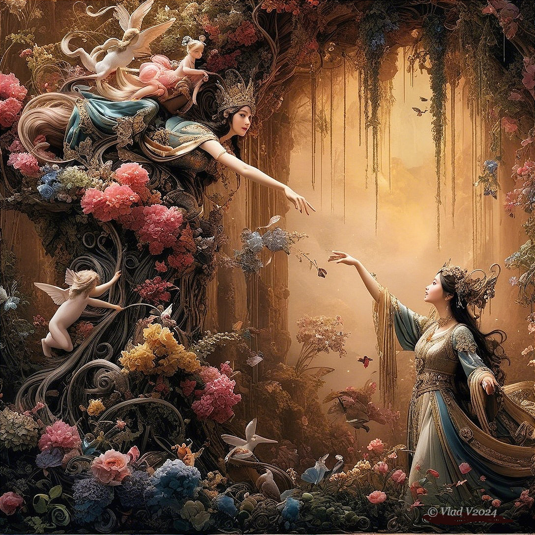 Fairy and Elf in a Dreamy Floral Haven