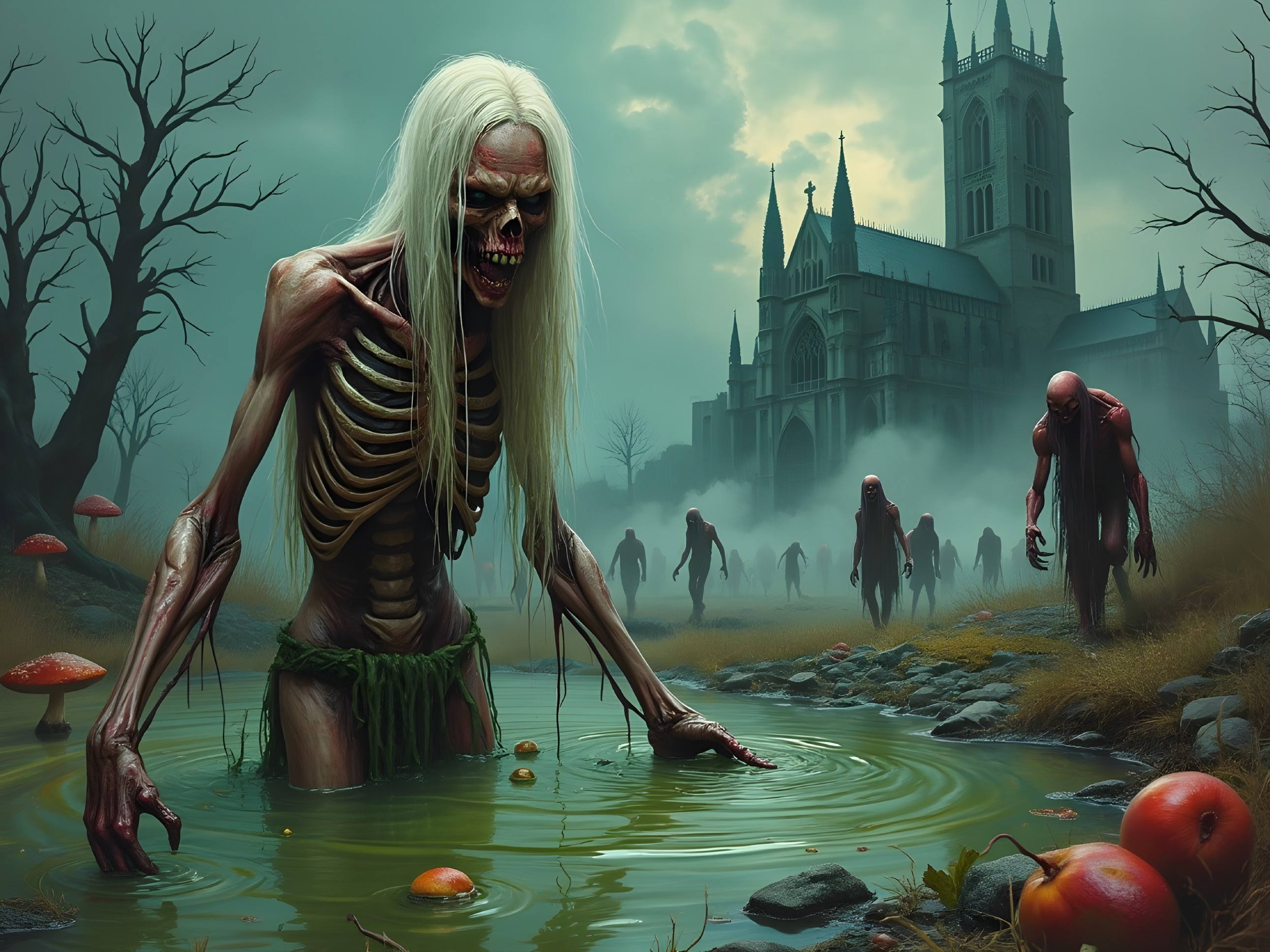 Skeletal Figures in a Misty Swamp Scene