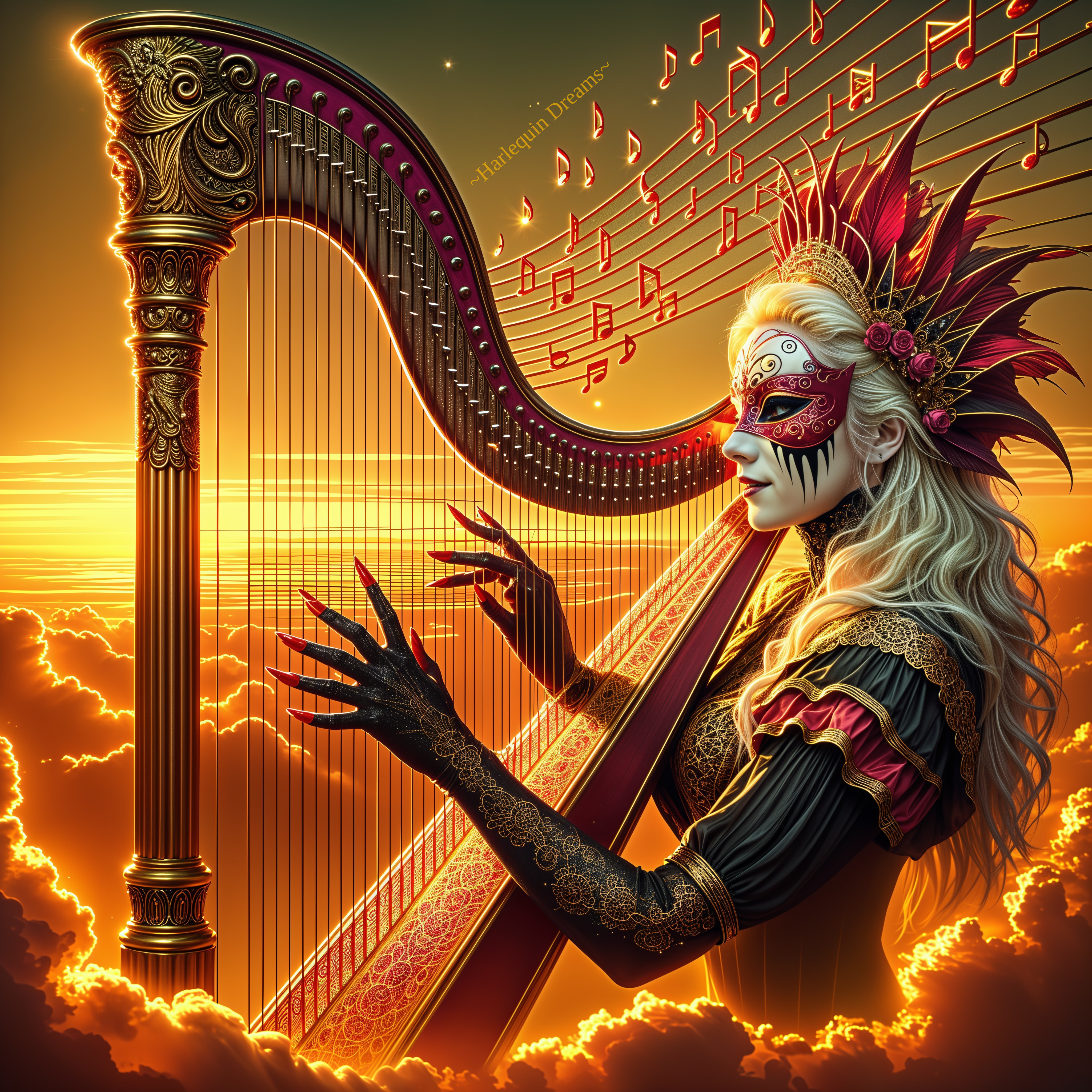 Mystical Harpist Beneath Sunset Skies