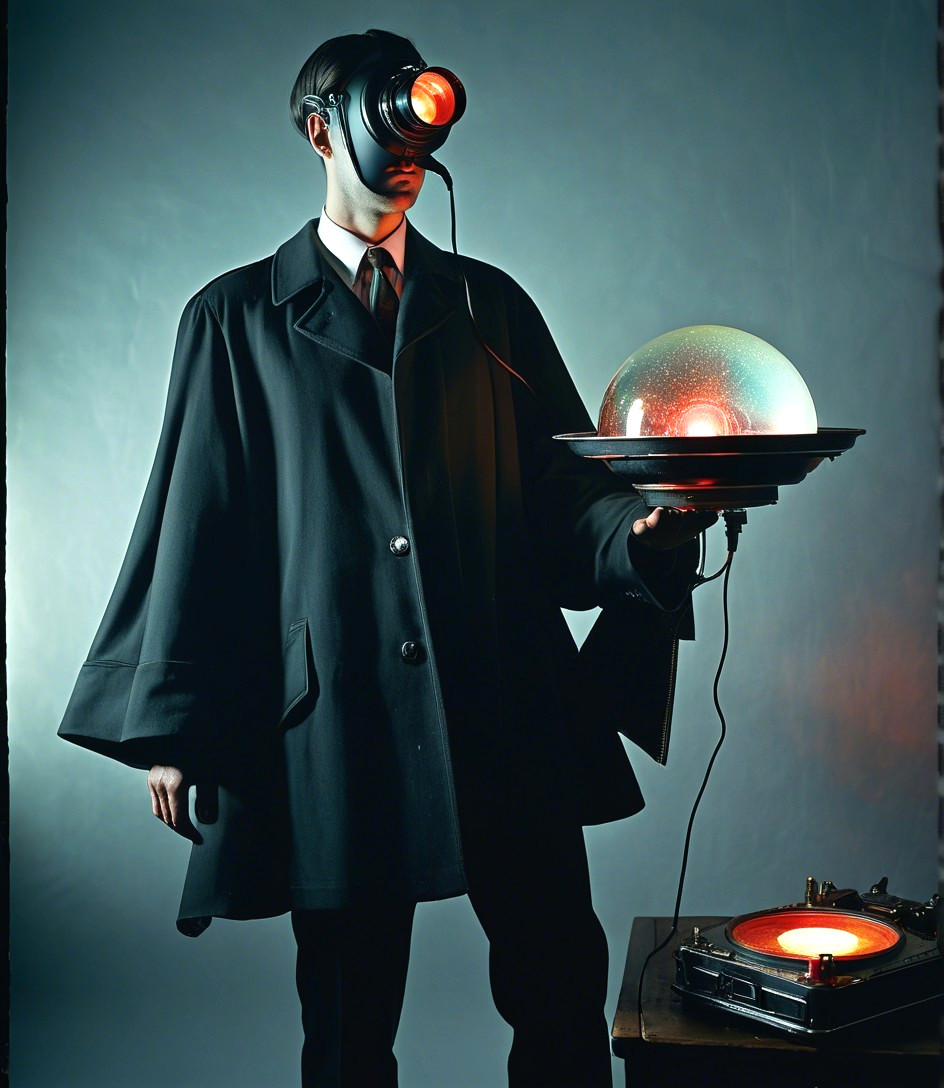 Mysterious Figure with Glowing Orb and Turntable