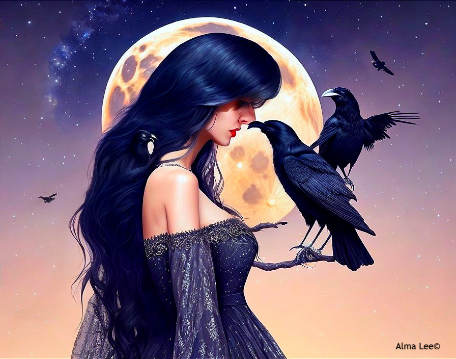 Moonlit Mystique: A Dark-Haired Woman and Her Raven
