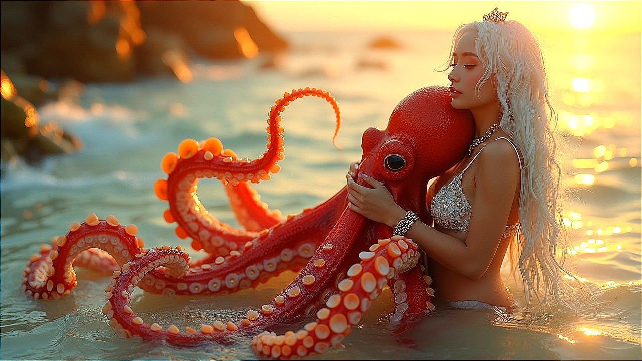 Sea Princess Embracing an Octopus at Sunset