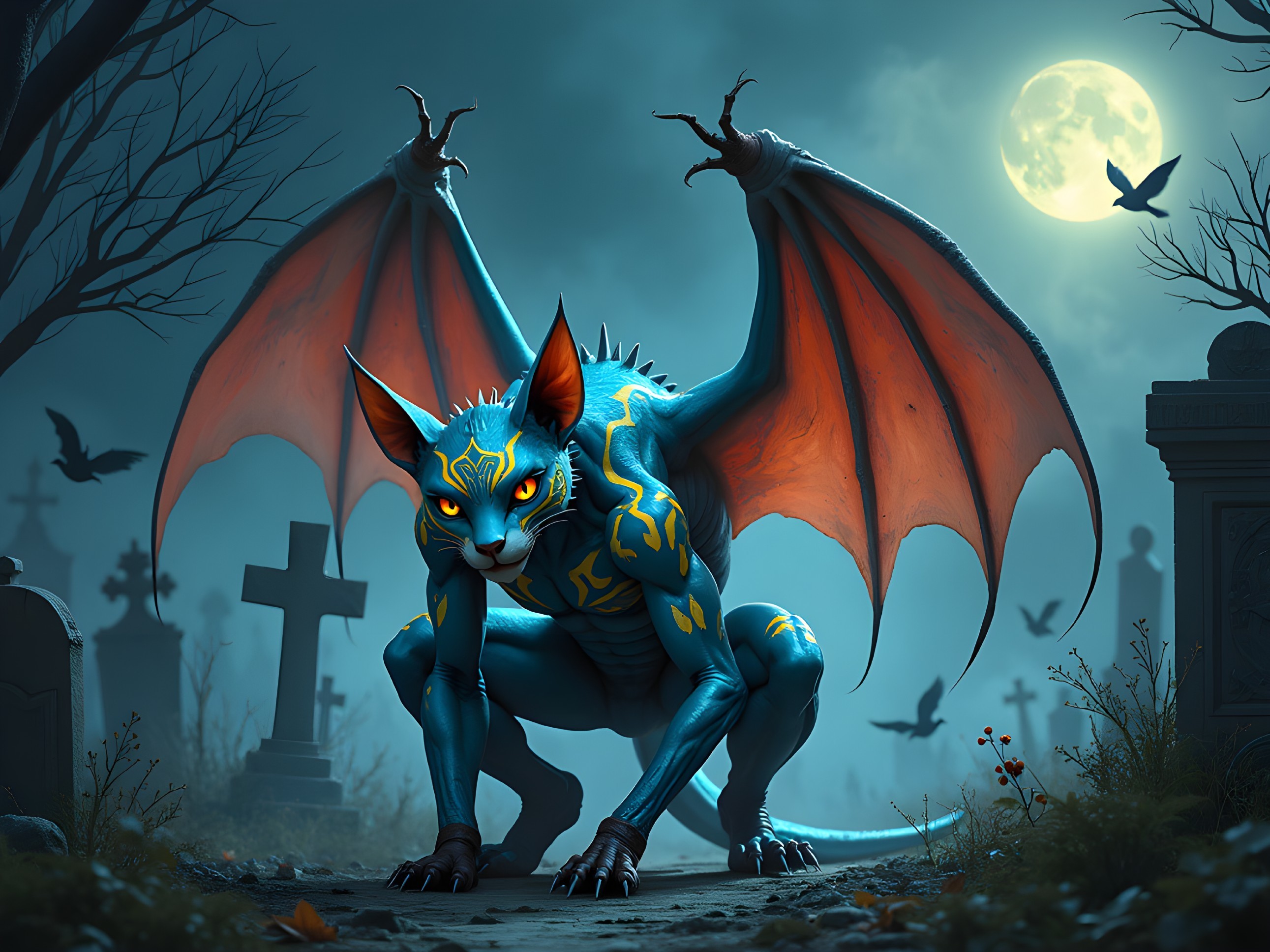Mystical Beast in a Moonlit Graveyard