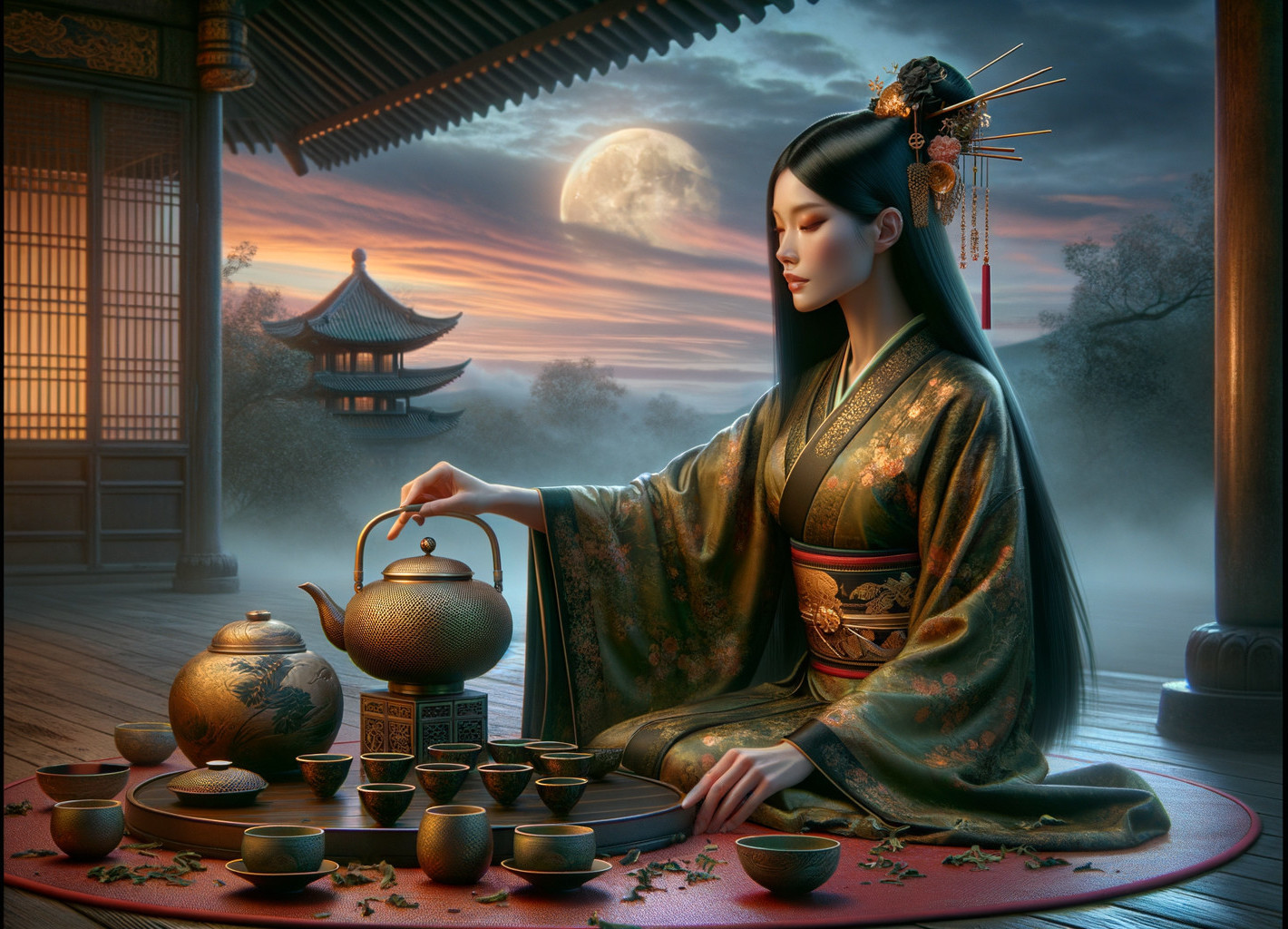 Moonlit Tea Ceremony in Misty Mountains