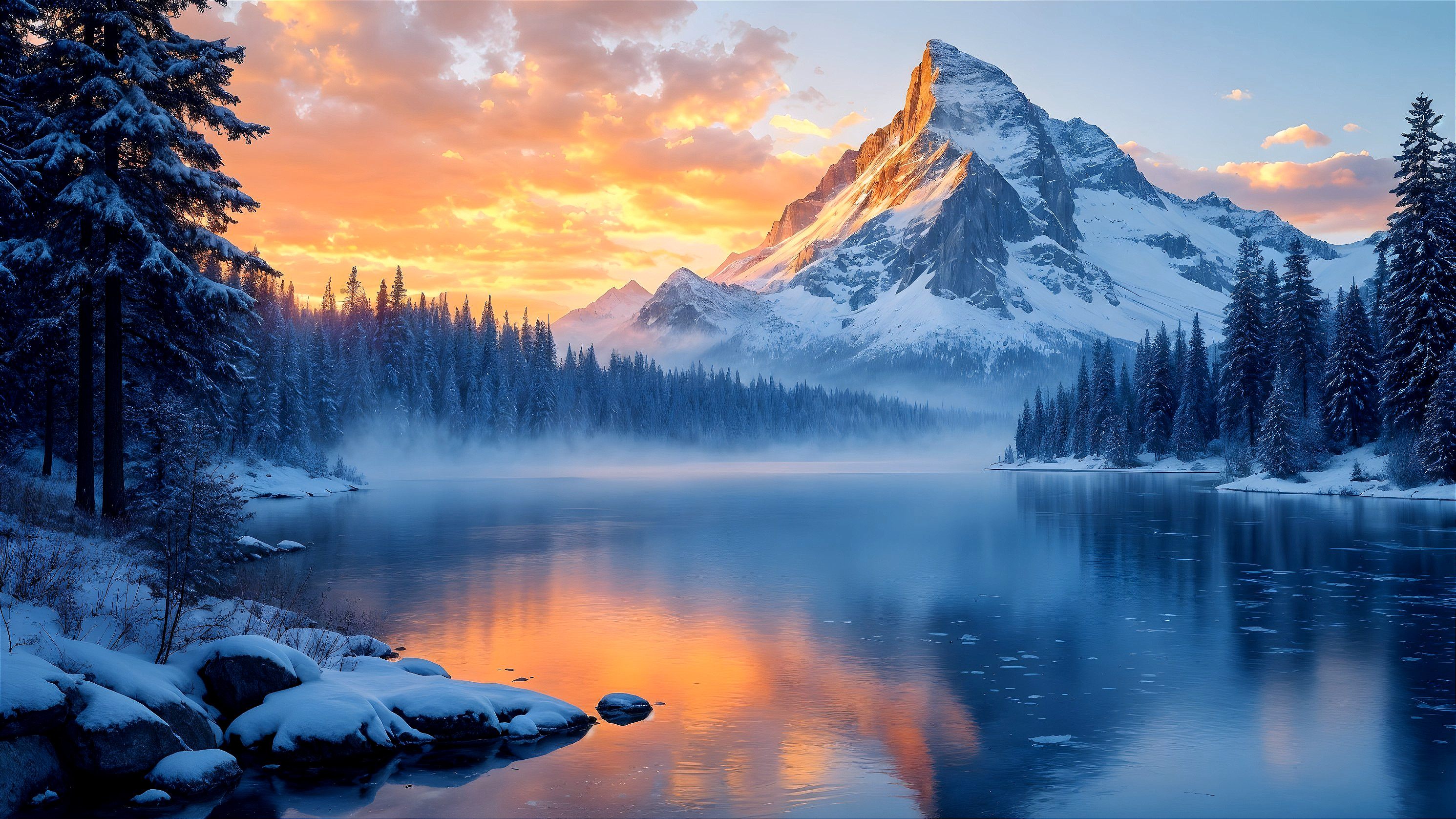 Snowy Mountain Landscape with Misty Pine Forest in Serene Ambiance