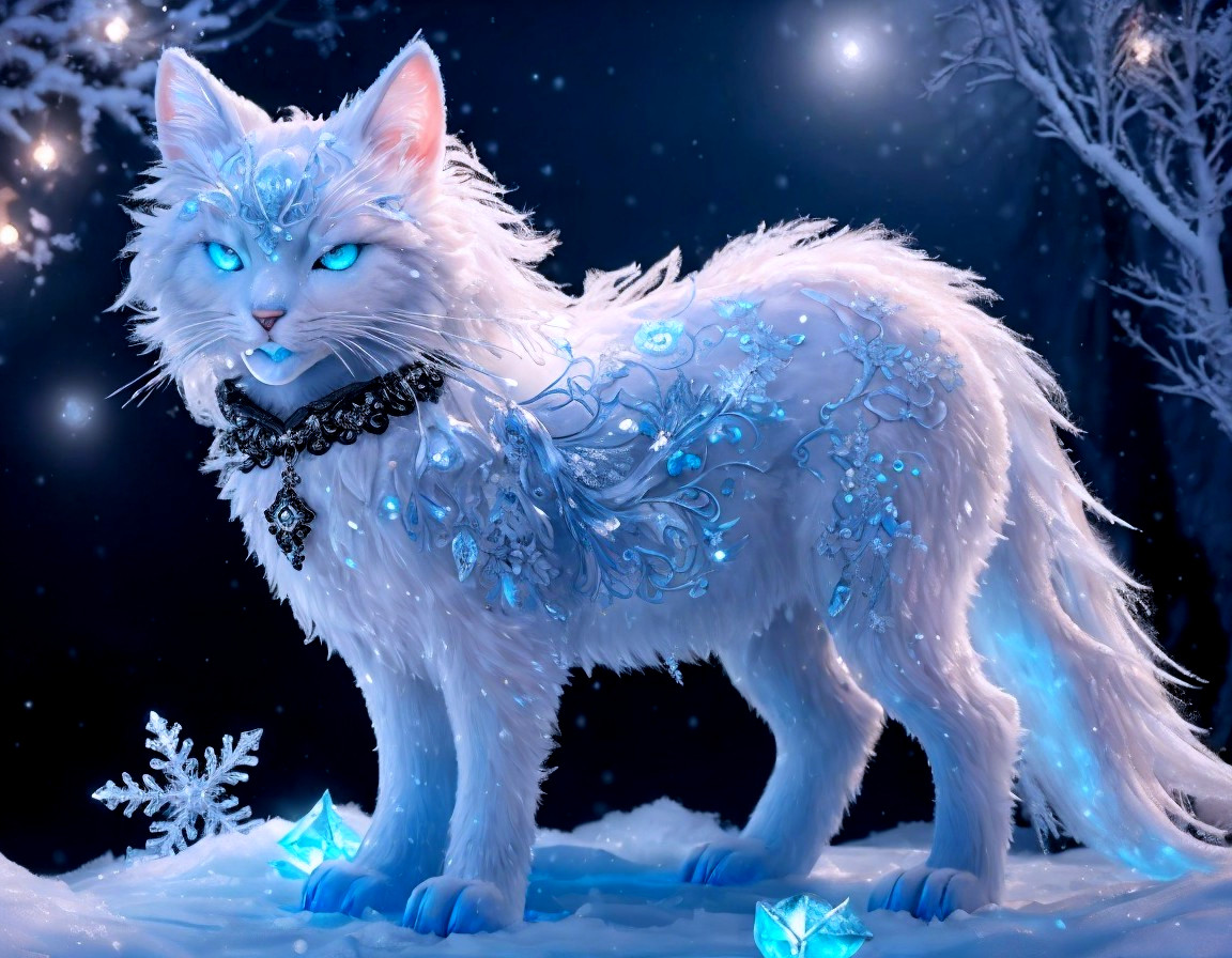 Norwegian Forest Cat in a snow-covered winter landscape with the Aurora Borealis in the starry sky