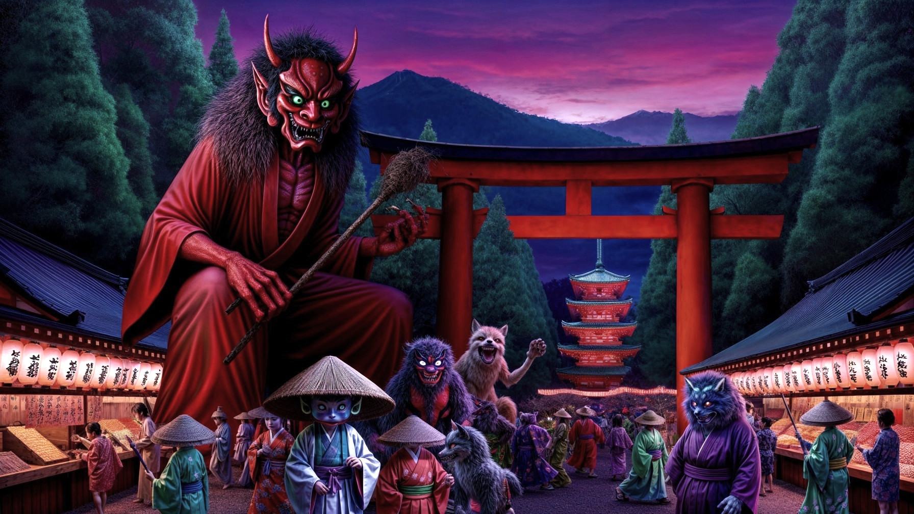 Brave Japanese girl Hina and the evil spirit yokai oni.