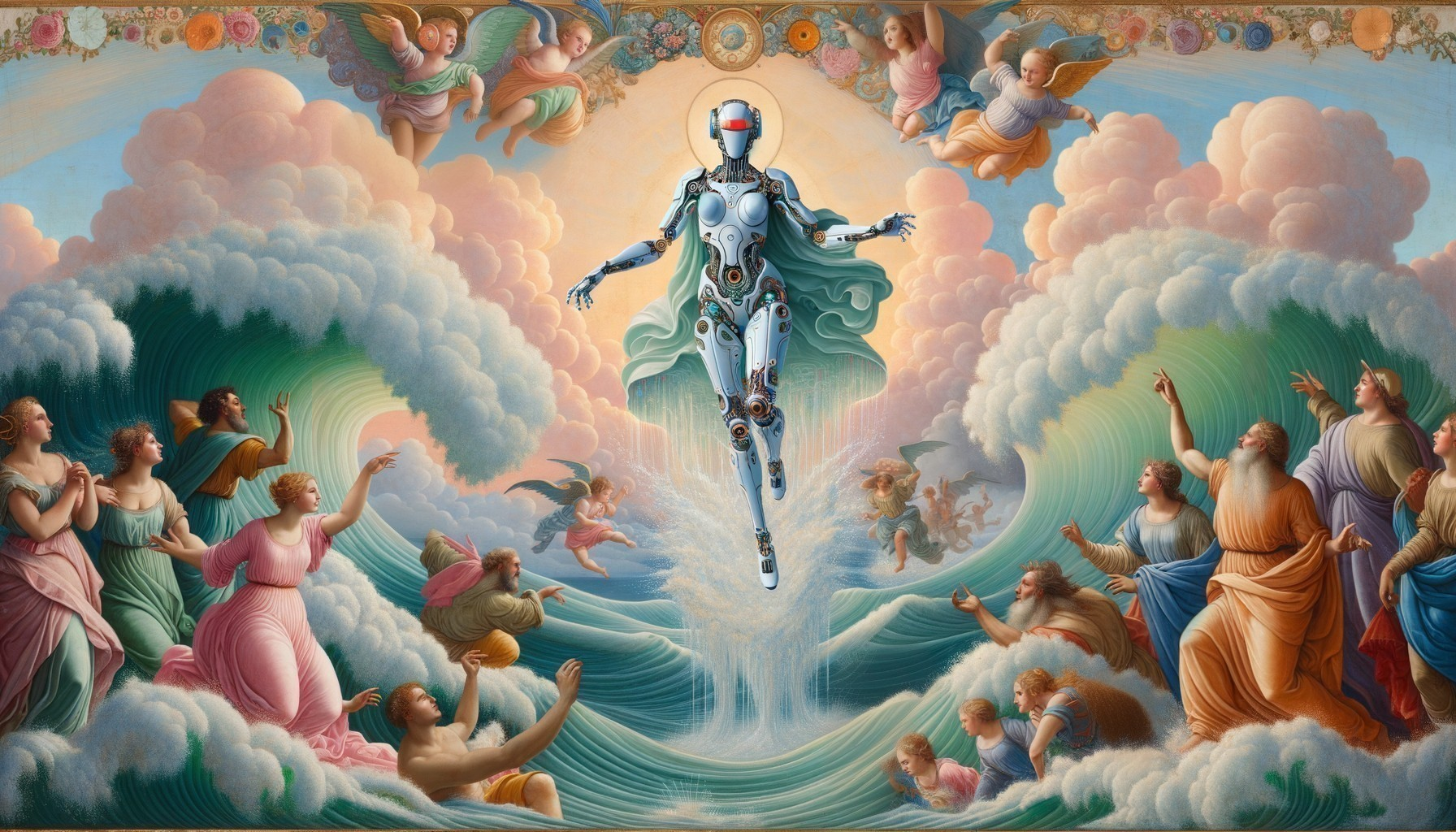 The artist Sandro Botticelli. The painting "The birth of a cyborg diva from sea foam"