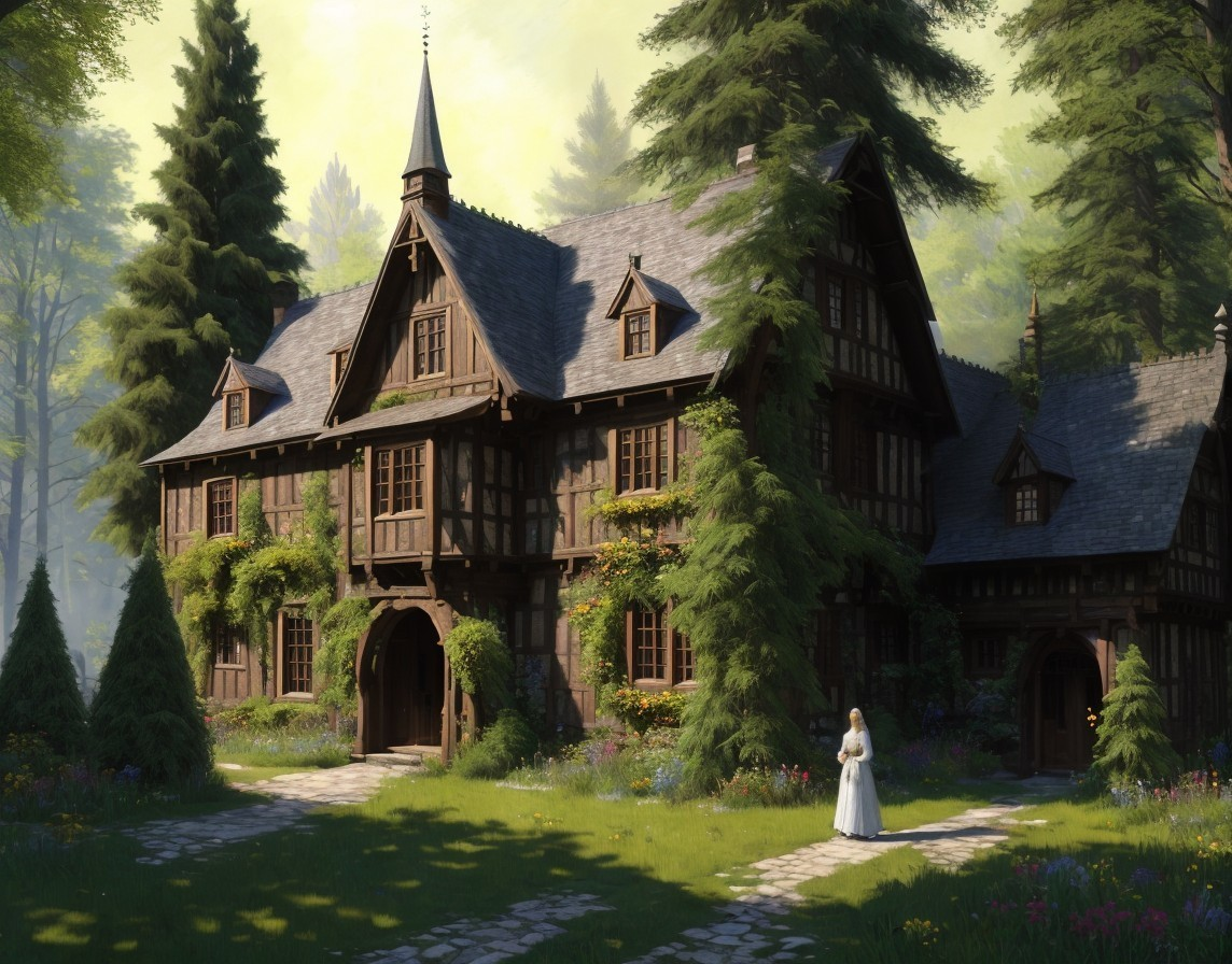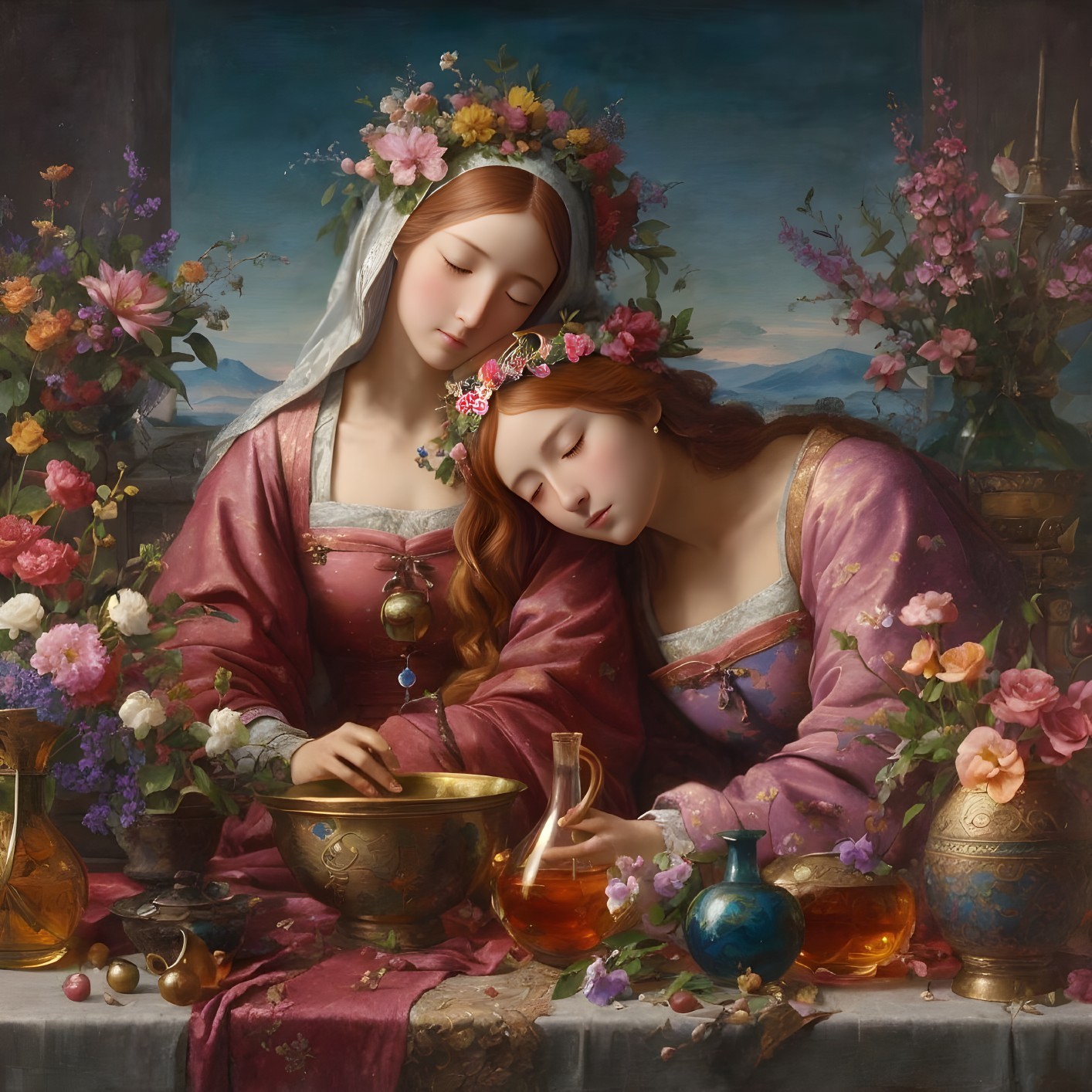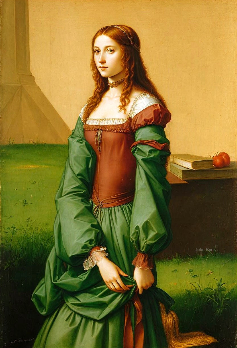 Tranquil Renaissance Portrait: Mother and Children in Lush Landscape