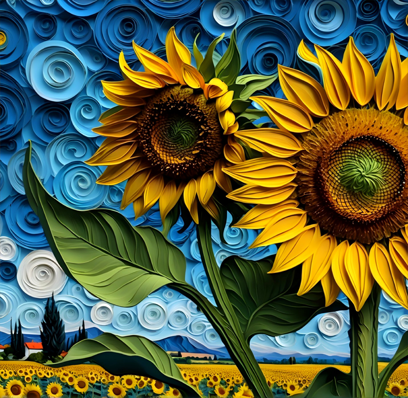Sunflowers in a Swirling Van Gogh Sky
