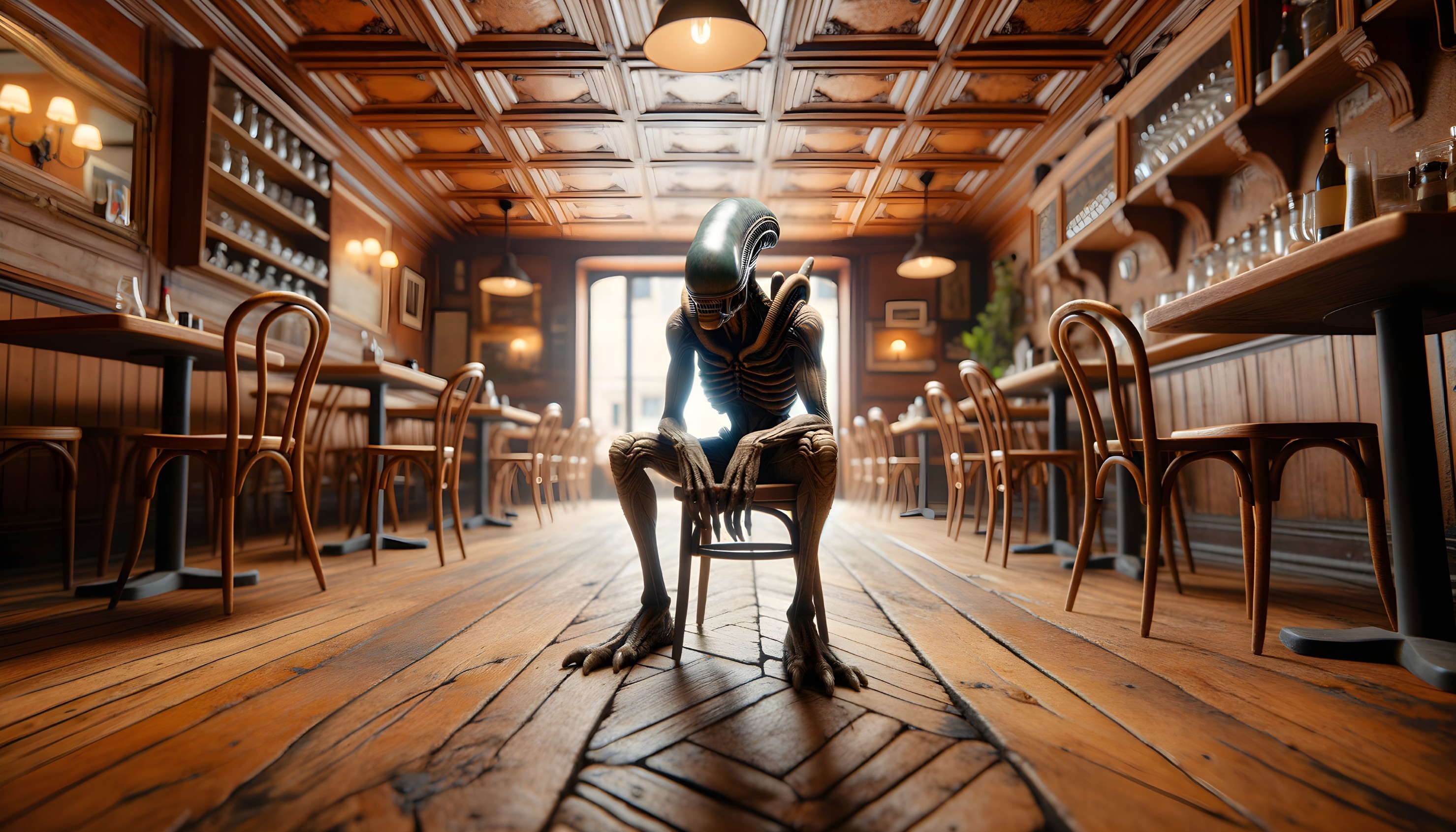 Lonely Extraterrestrial in Rustic Cafe