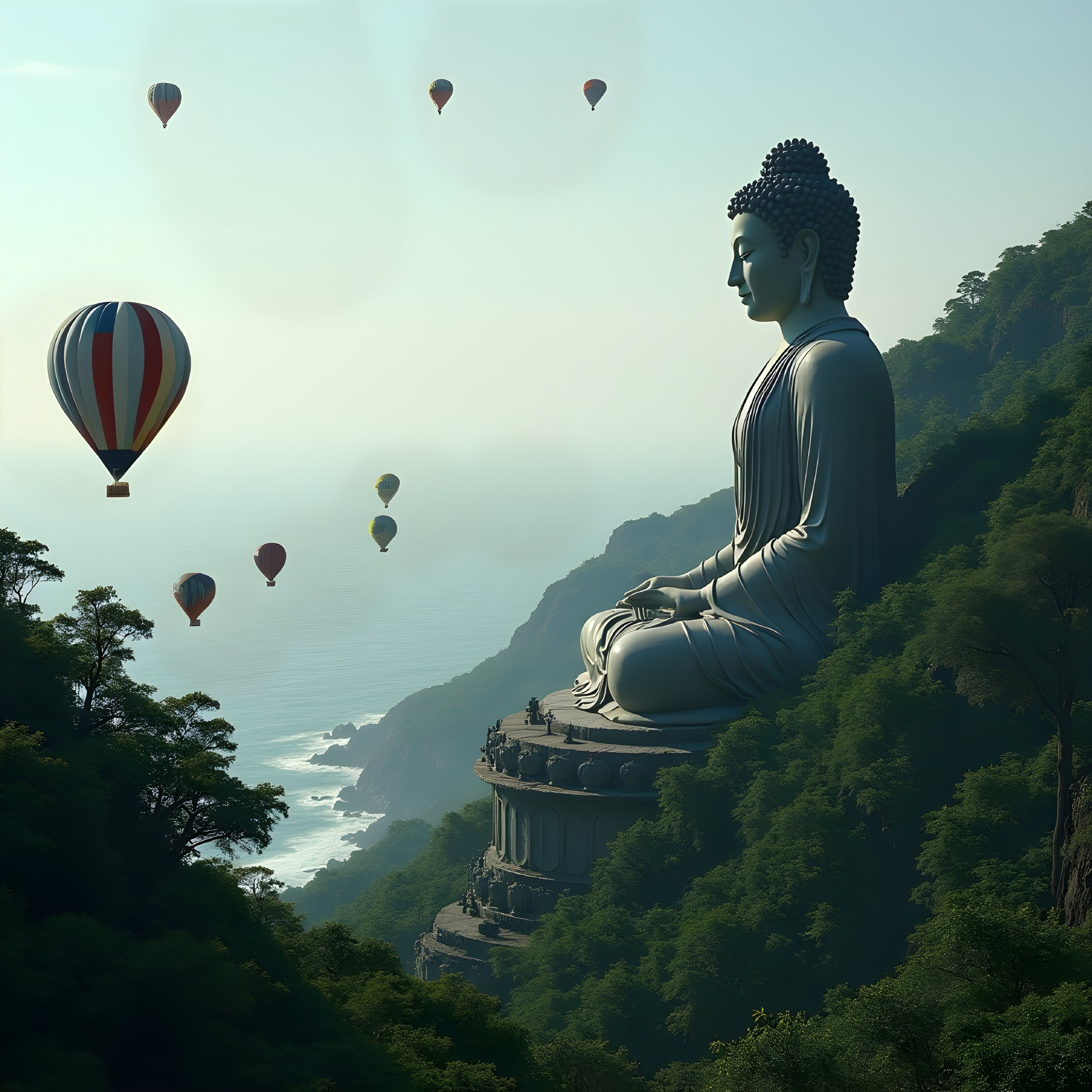 Colossal Tranquil Buddha Overlooking Misty Shoreline Ballooners