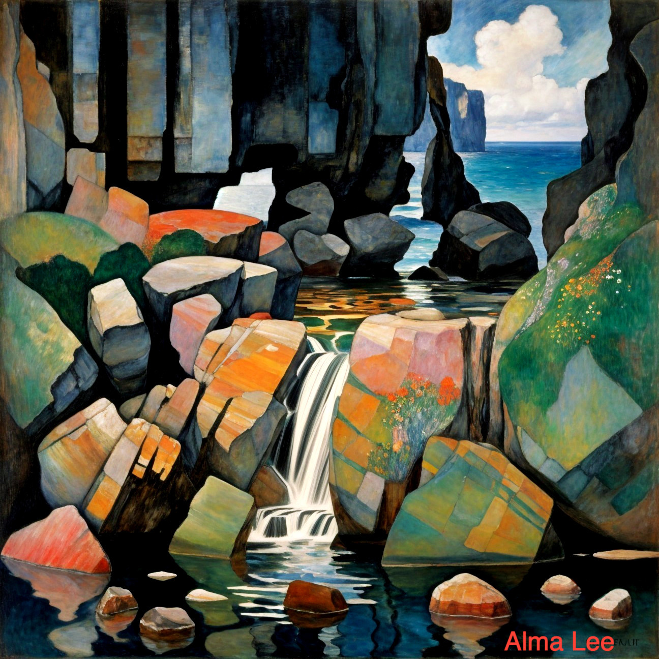 Vibrant Nature: Rocks, Waterfall, and Sea