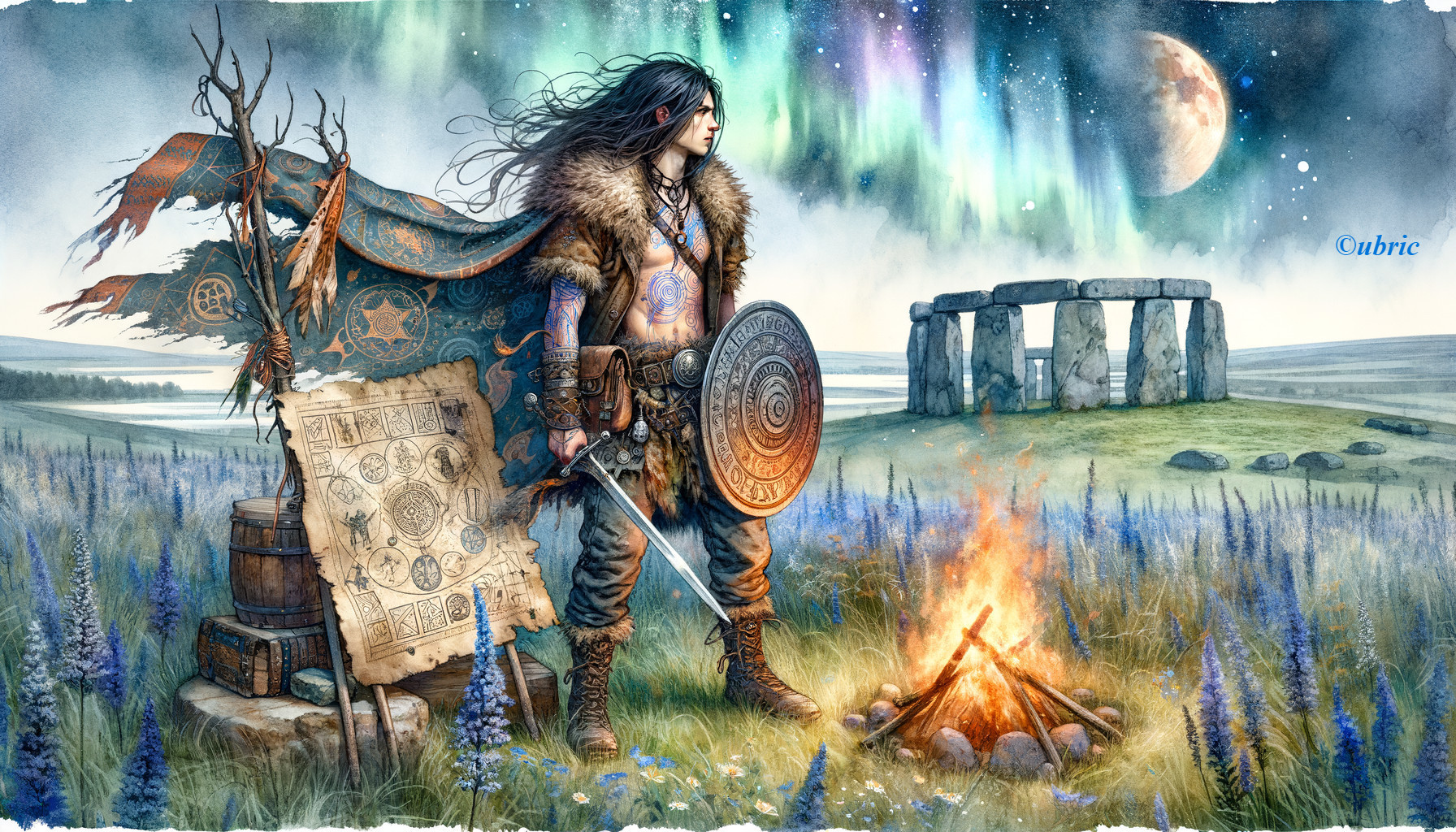 Warrior in a Mystical Aurora Landscape