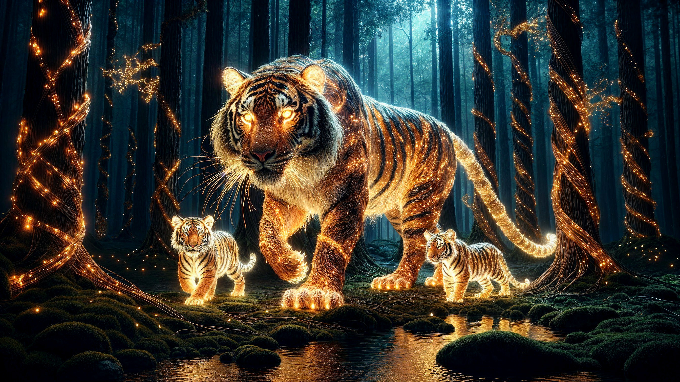 Majestic Tiger and Cubs in Enchanted Forest