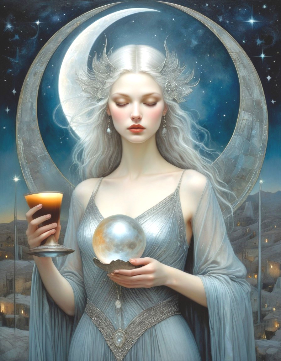 Cosmic Silver: Artistic Woman with Intricate Tattoos
