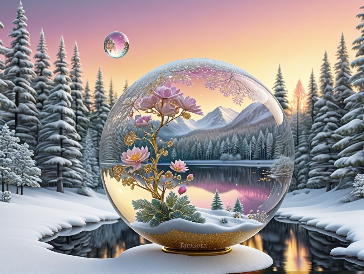 Golden Water Lilies in a Winter Snow Globe