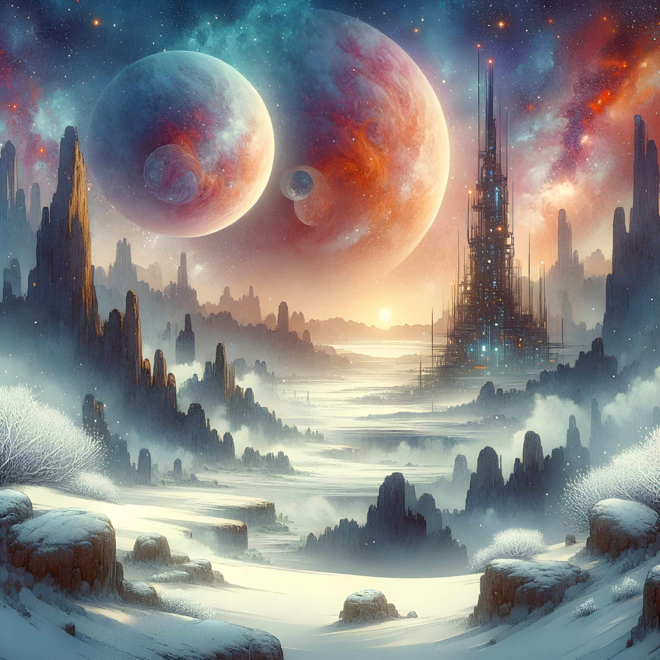 Majestic Snowscape Under Twin Planets