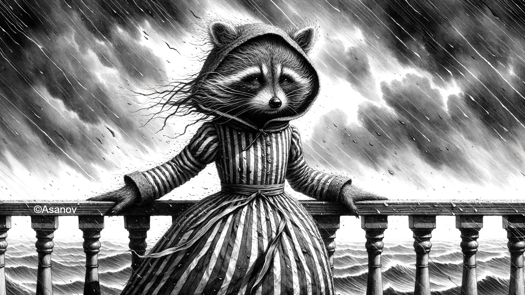 Raccoon in Rainy Solitude on the Balcony