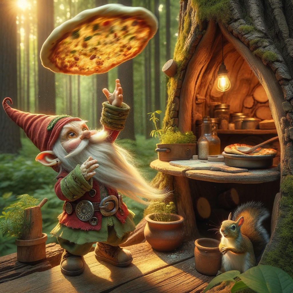 Gnome and Mechanical Squirrel in a Dreamy Garden