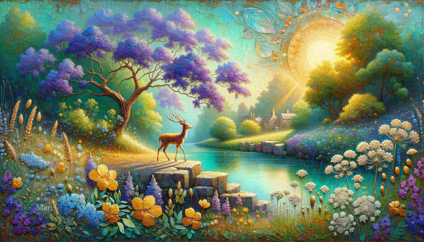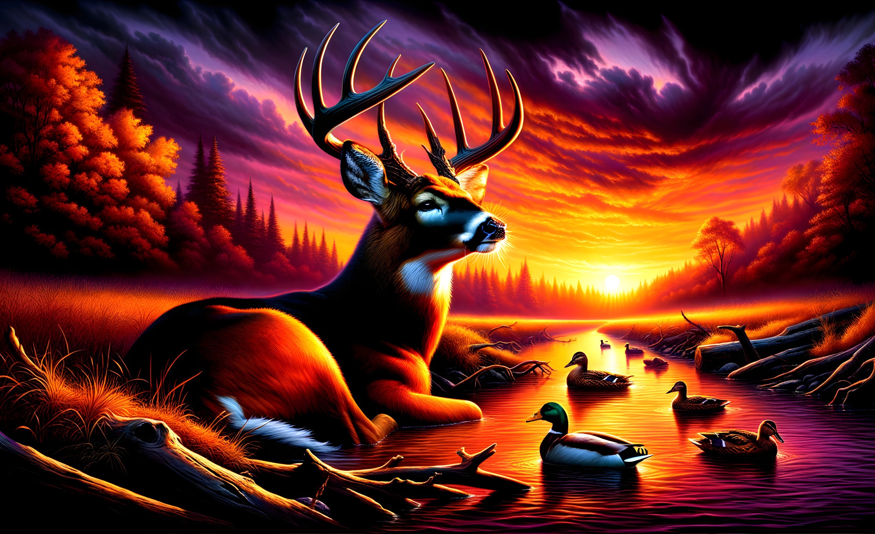Sunset Serenity: Stag, Ducks, and Radiant Sky