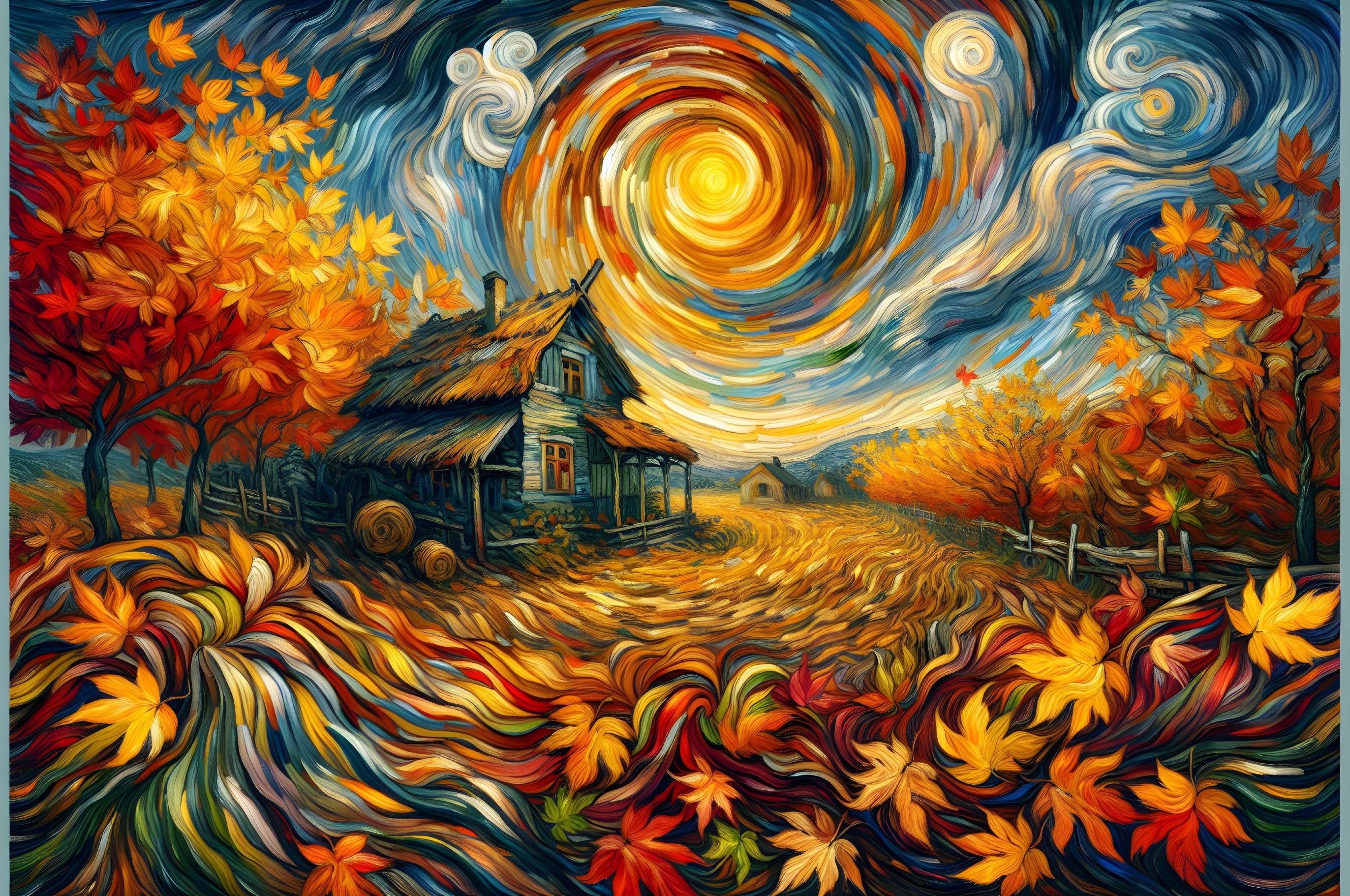 Autumn Serenity: A Cozy Cottage Scene, swirling sun , style Vincent van Gogh