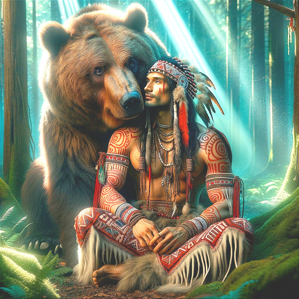 Big furry bear-man by stream deep in lush Summer forest making eye contact with viewer.